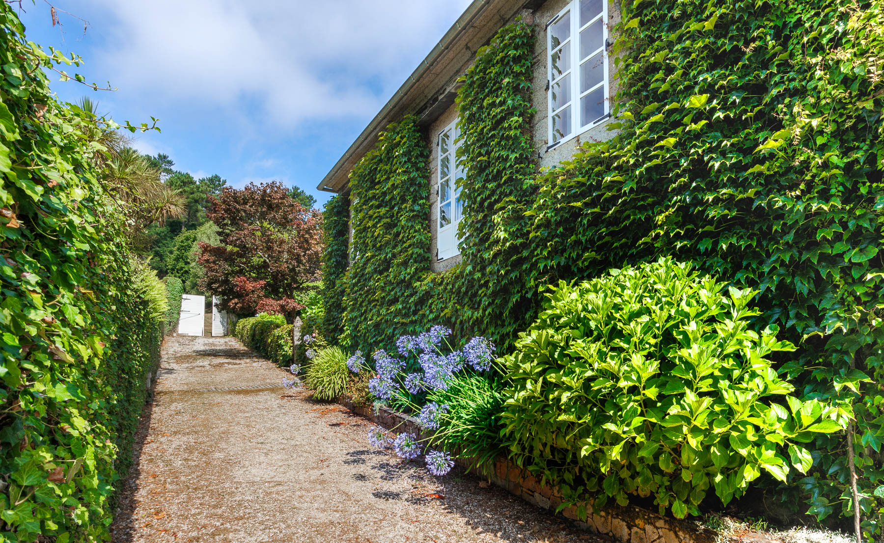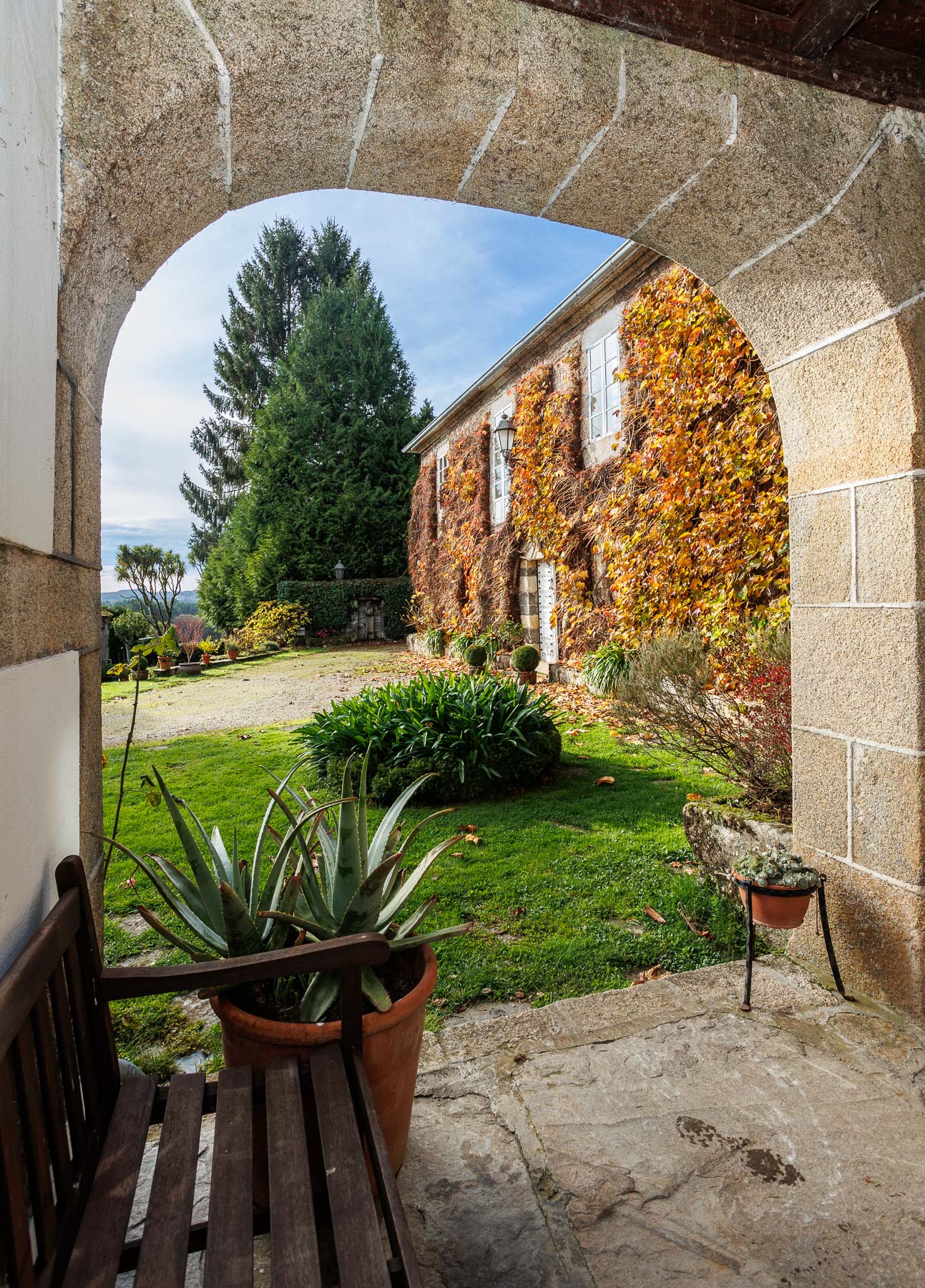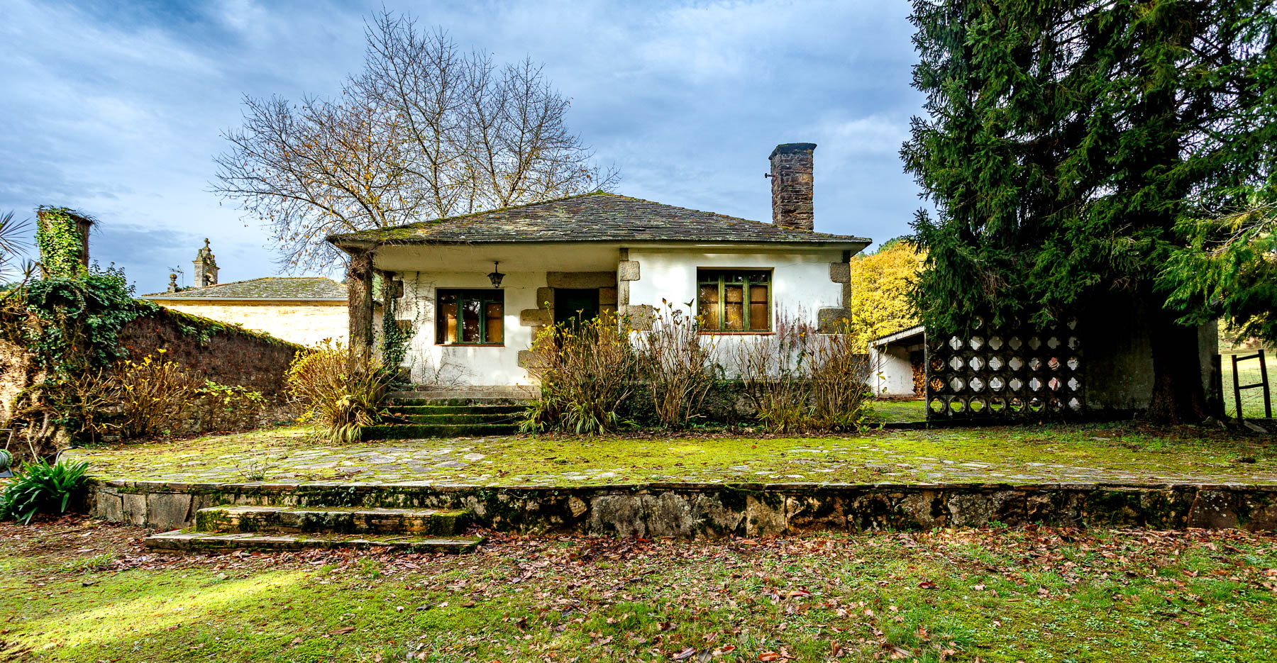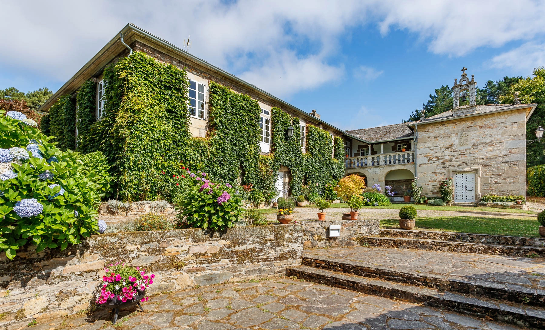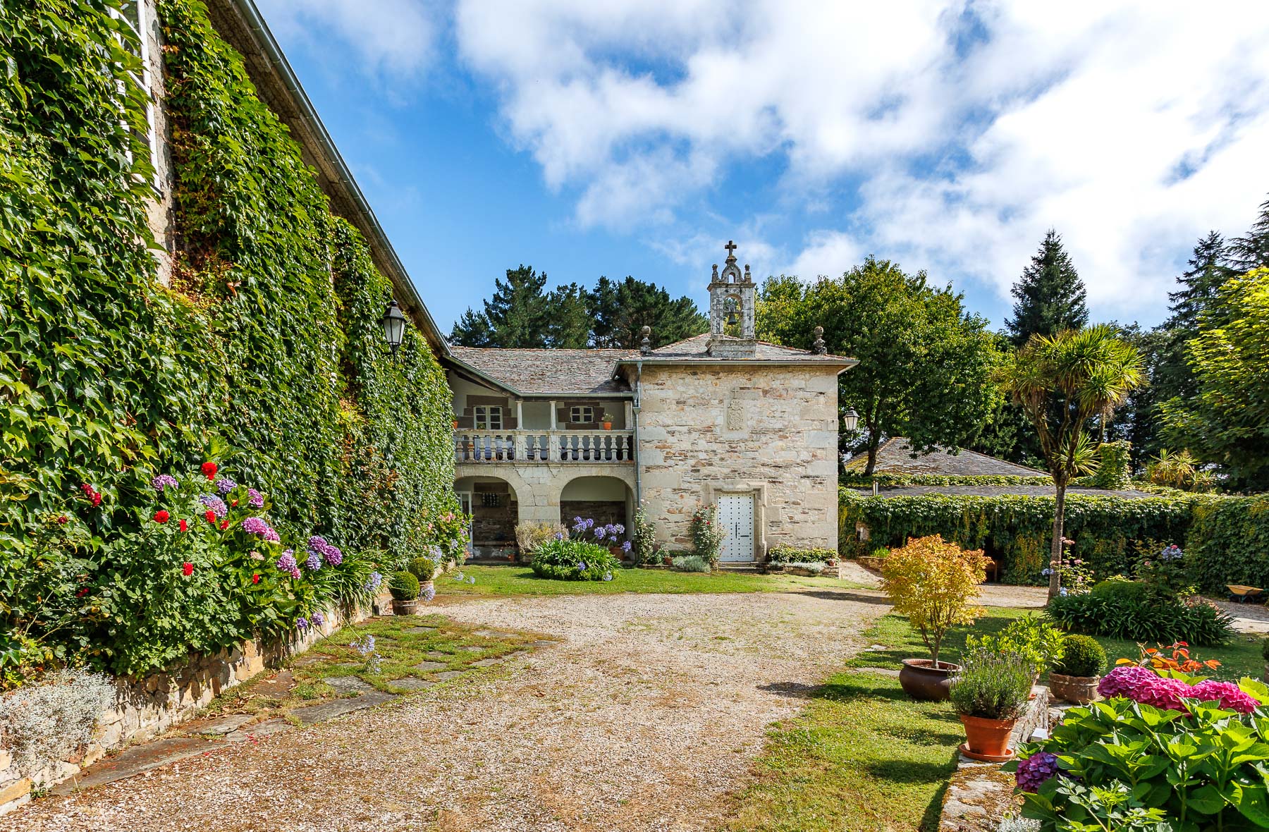 The pazo is an L-shaped stone construction with two storeys and a hipped roof, fully restored while preserving its original character and essence. Its ivy-covered façades give it a distinctive and characterful appearance that changes with the passing seasons.