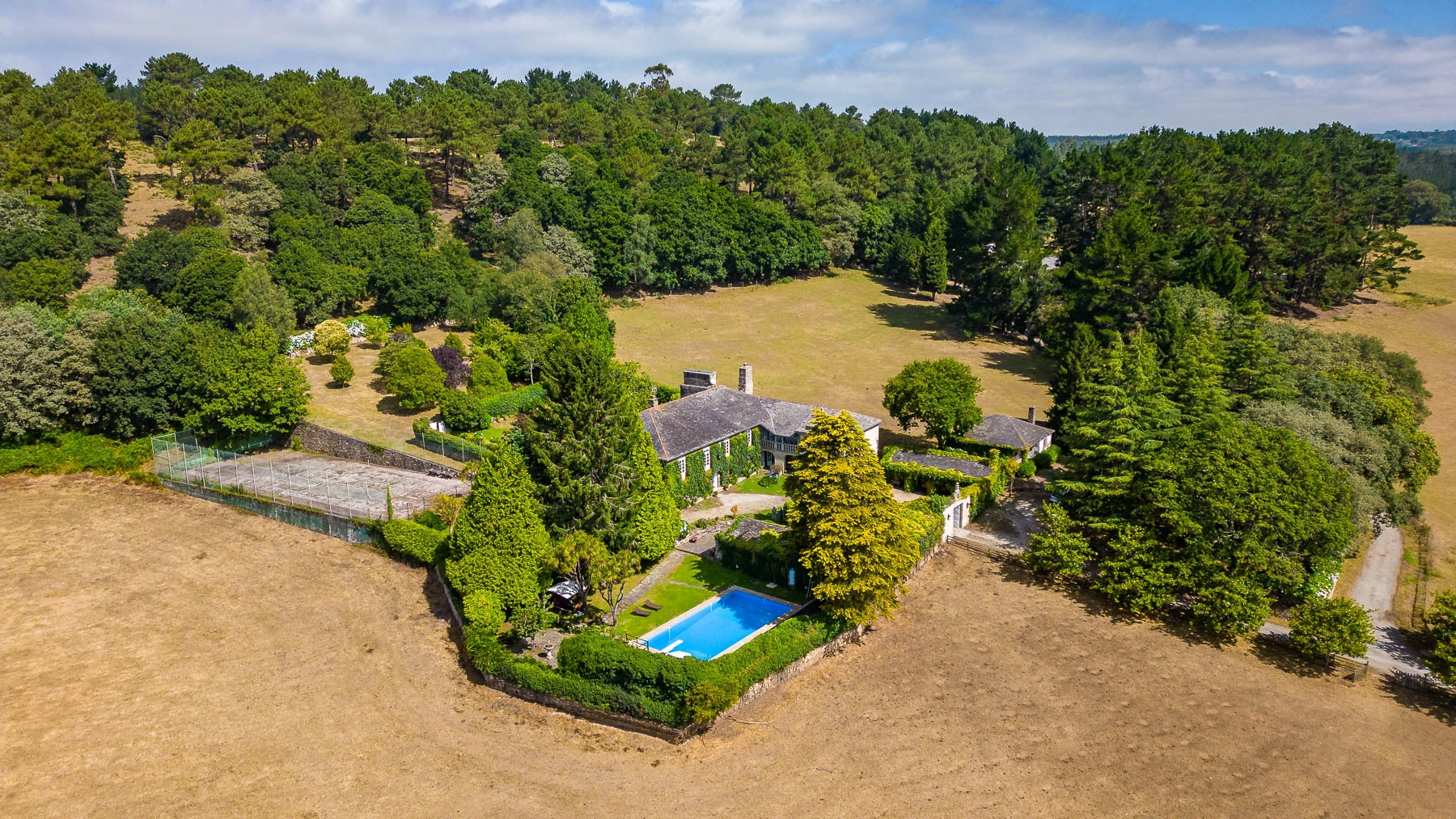 From the road, a straight path flanked by trees leads to the main complex, completely restored and consisting of a pazo with chapel, outdoor pool, sports court, barbecue area and a garage with viewpoint offering privileged views of the surroundings. An independent guest house, agricultural facilities and more than 42 hectares (103.78 acres) of meadows and forests complete this ensemble of uncommon size and historical value.
