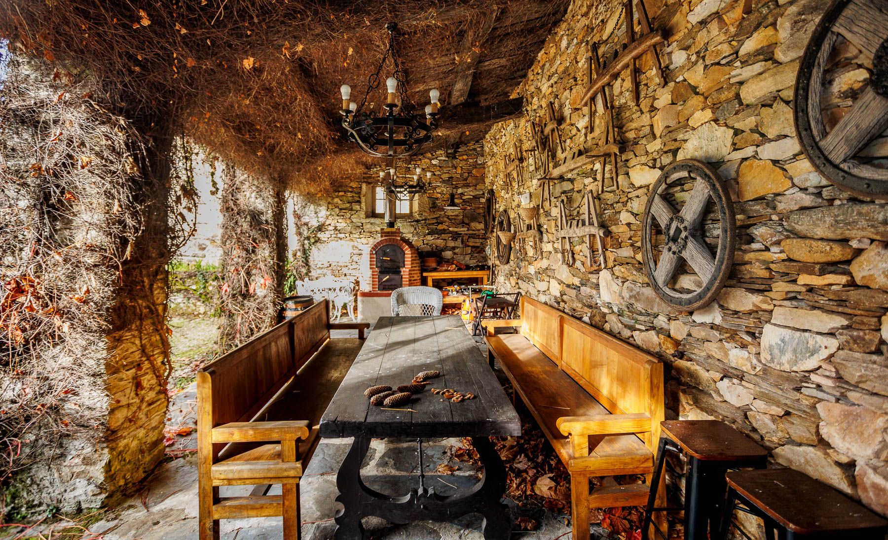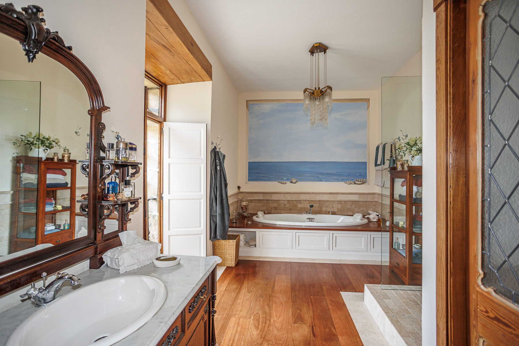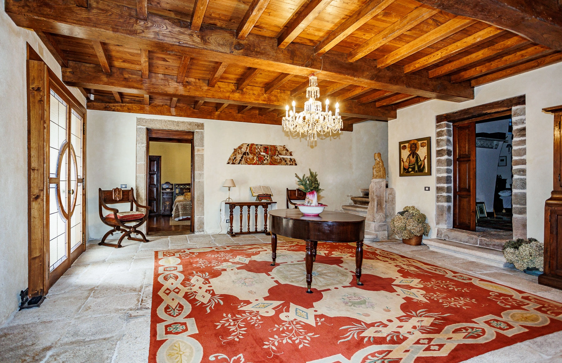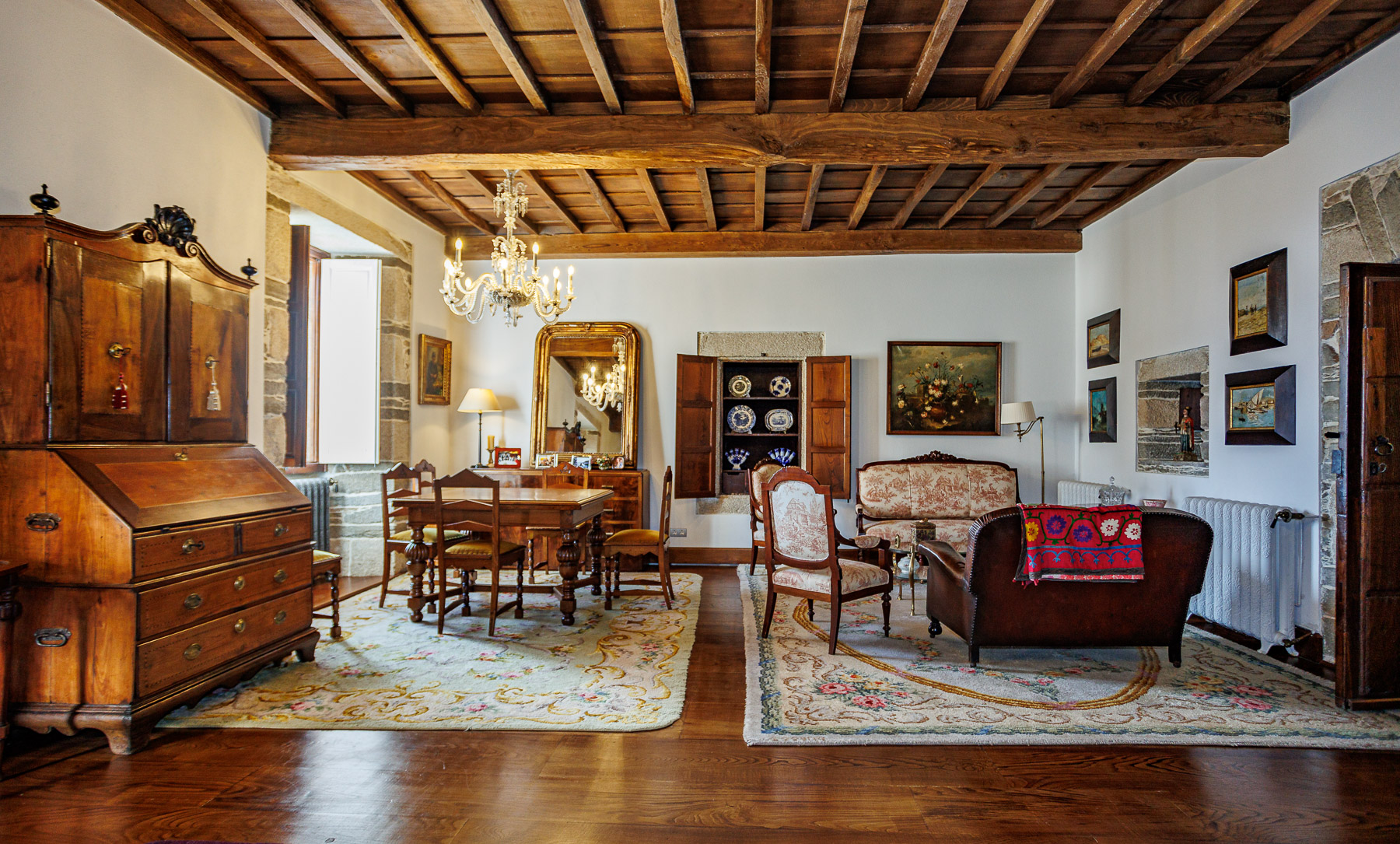 Each room is unique and conveys the history of the place, featuring carefully curated period furniture that harmonises with the building and its distinguished character. The spaces preserve original elements that bear witness to the history of the property, with stone masonry walls, ashlar stonework and exposed timber beam ceilings. Doors and windows are solid chestnut and cedar wood with double Climalit glazing.