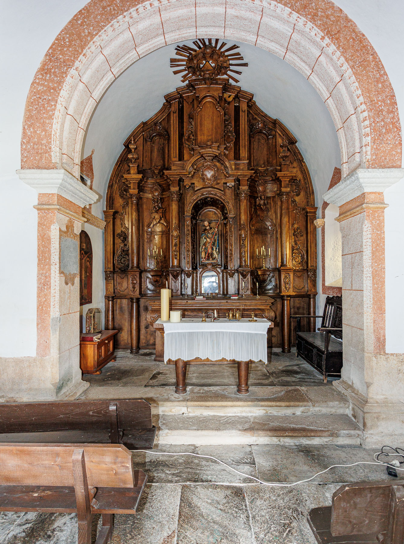 The chapel, integrated into the main structure of the pazo, dates from 1766 and is an example of baroque style with an exceptional carved wooden altarpiece. It features a nave and presbytery on the ground floor, and a choir on the upper floor accessible from inside the pazo.