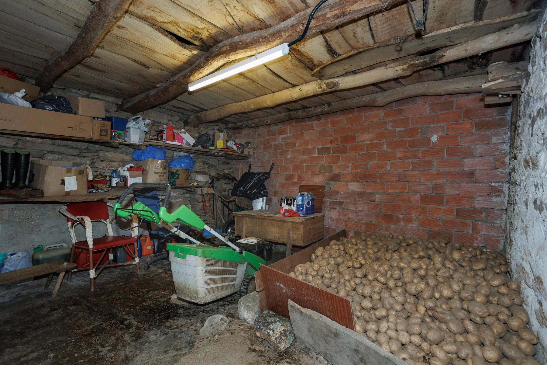 The main building is a stone construction in the rural tradition, with rubble stone walls and a slate roof. Spread over two open-plan floors, currently divided in half by a partition wall creating four independent spaces, the property offers a solid base for conversion into a home.