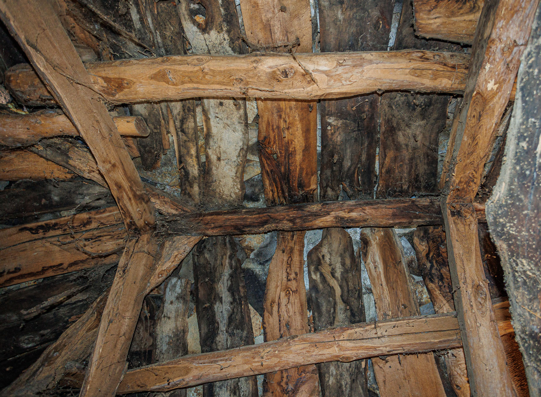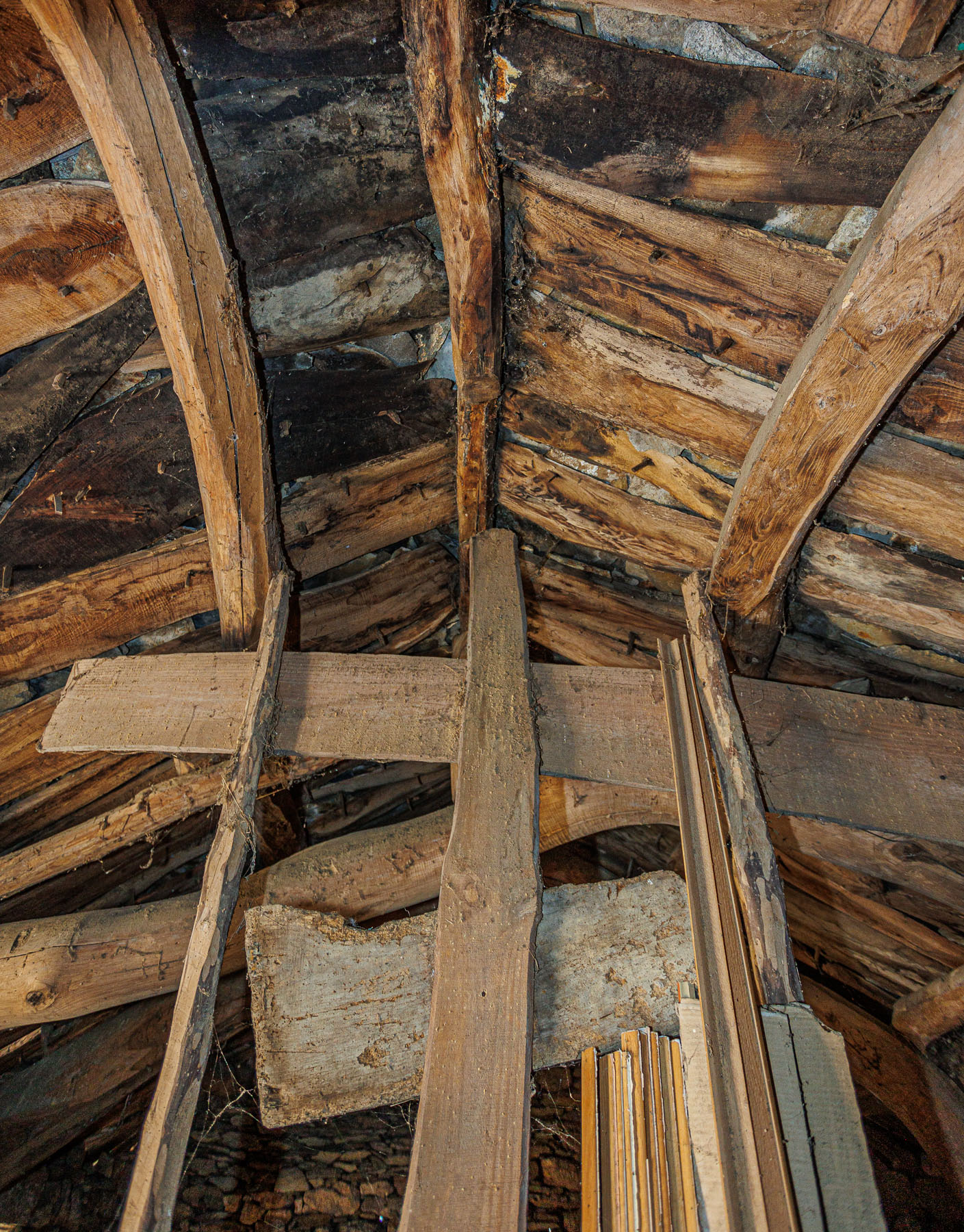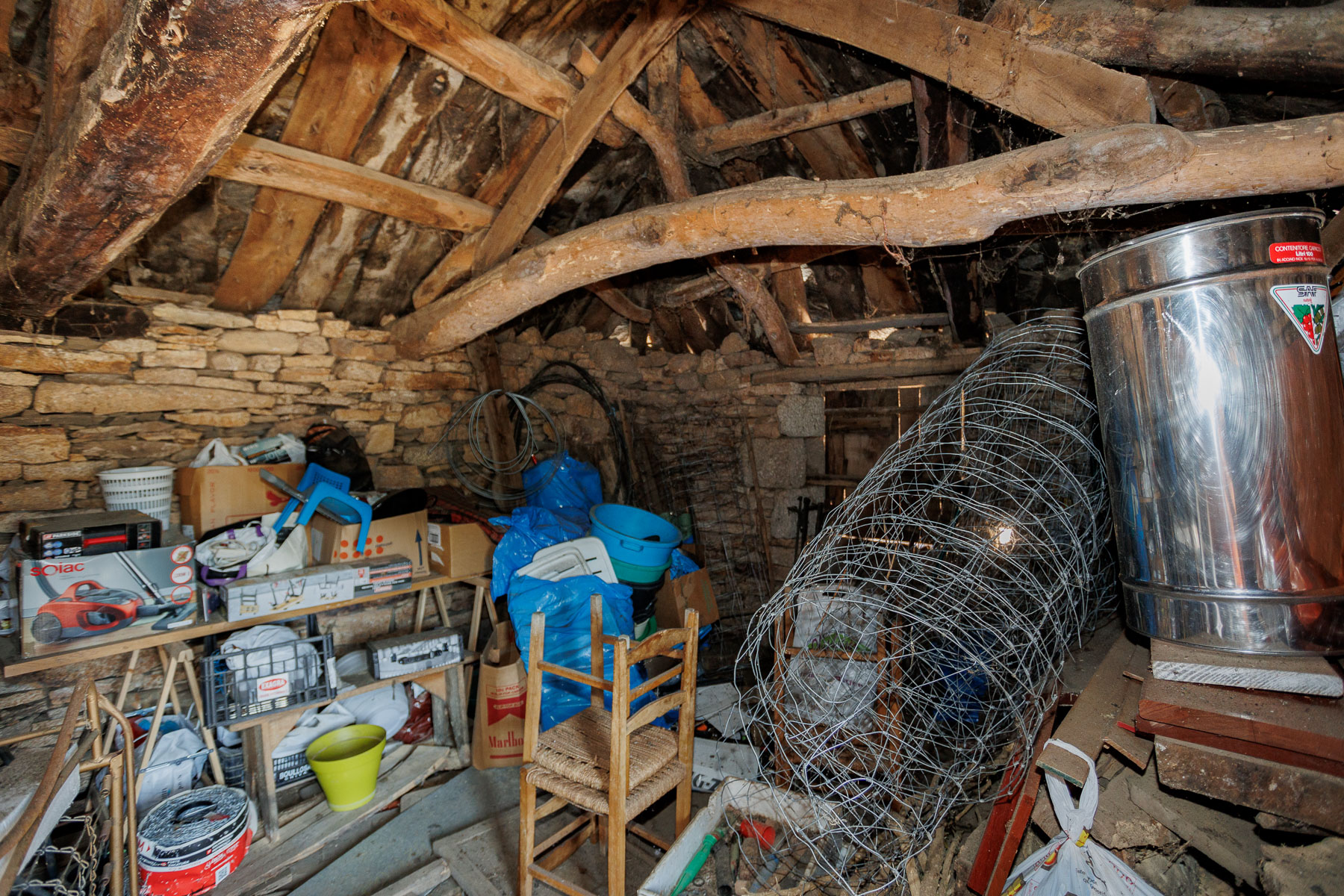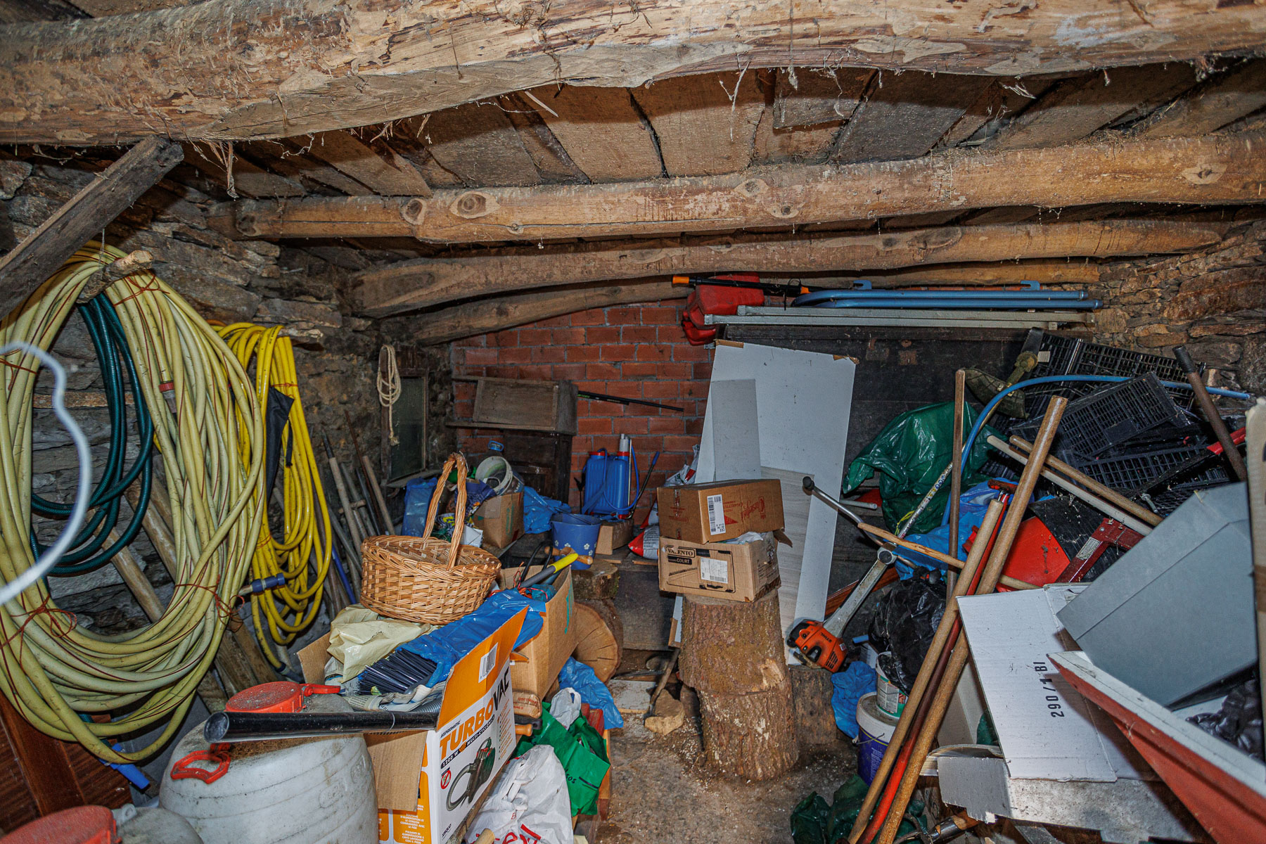 The interior reveals the original structure of exposed wooden beams in the roof and stone walls in good condition. The ground floor and upper floor are currently configured as open-plan spaces separated by a partition wall.