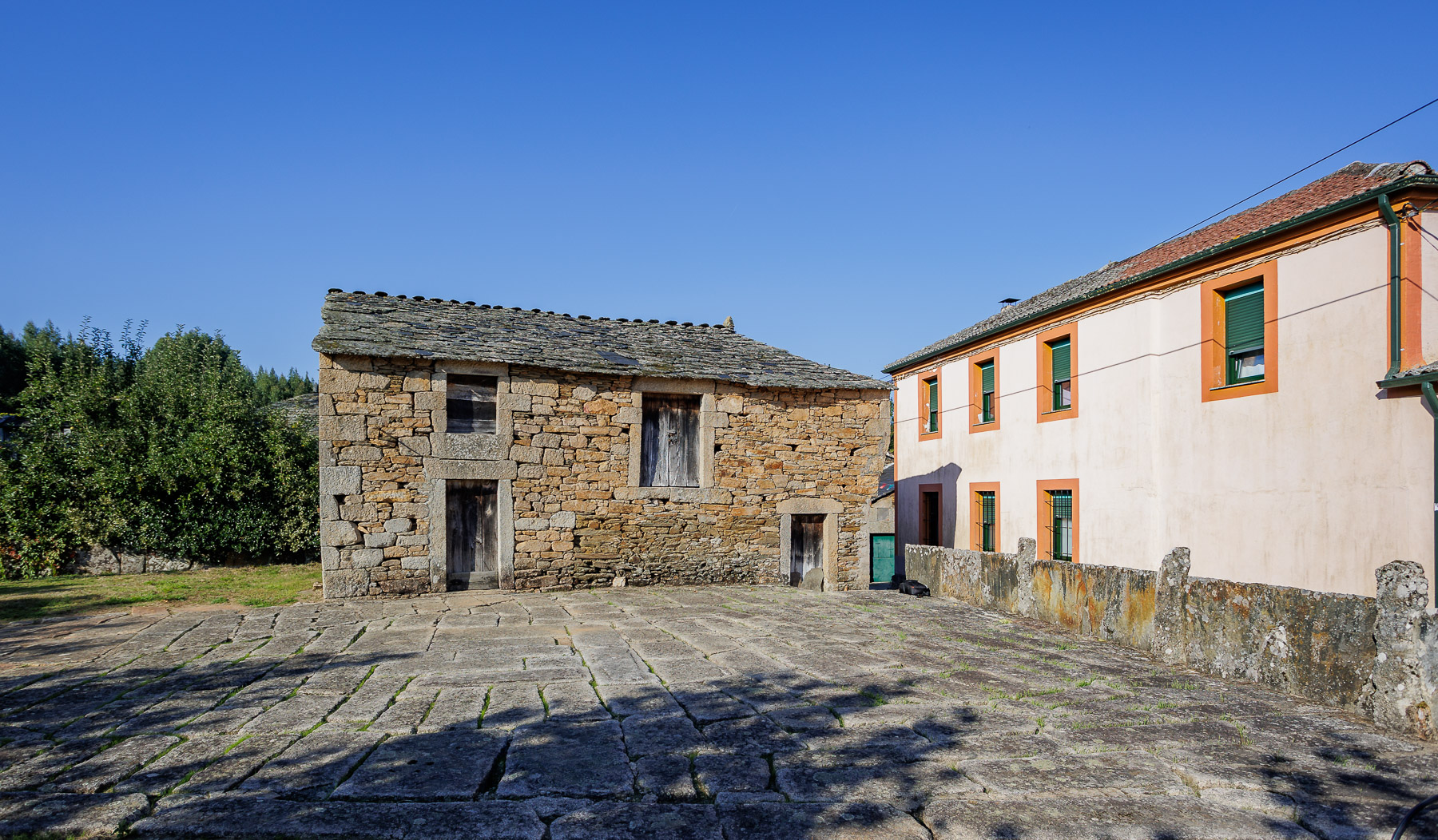 This property is located in a small village in the municipality of Outeiro de Rei, 5 km from Rábade —a town with all services and good transport links— and 22 km from Lugo city, very close to the Ladra river. The ensemble comprises two distinct elements: a two-storey stone house with its traditional paved threshing floor, and a plot with an orchard and fruit trees, part of which has building classification.