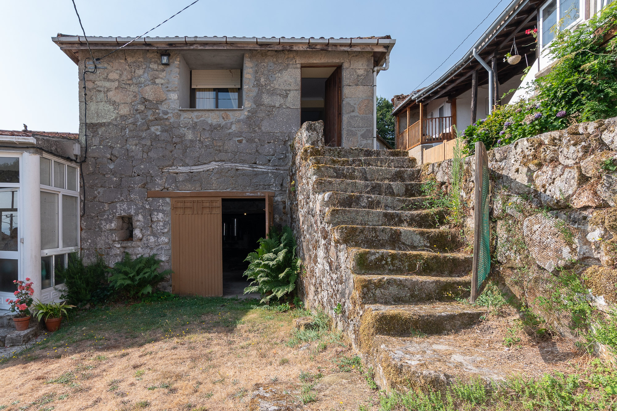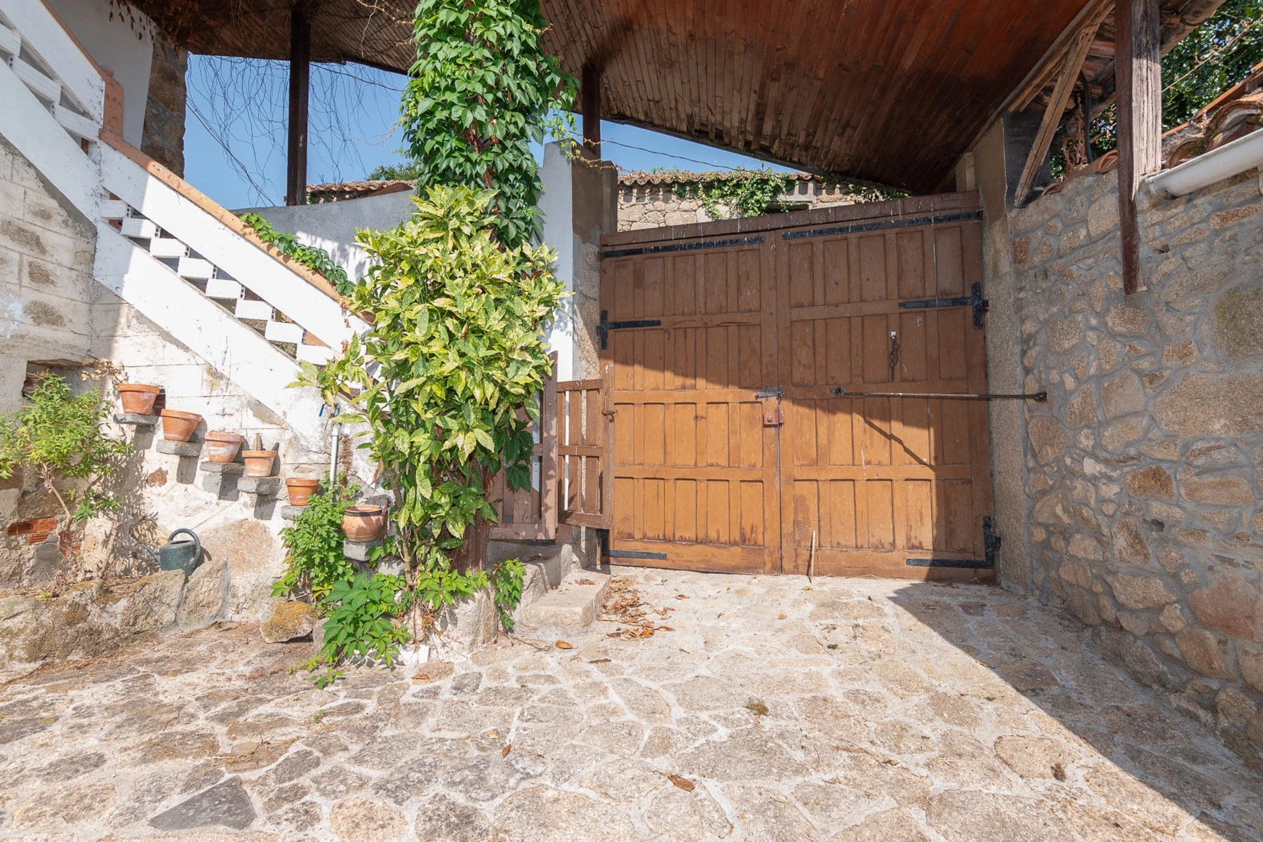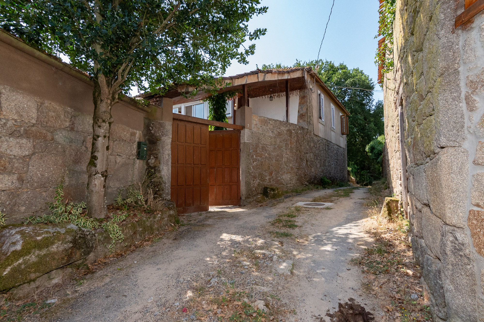 The property consists of two independent houses connected by a small shared courtyard, protected by a large stone wall that makes it an intimate and private space. The smaller house, approximately 100 years old, has direct access from the street on its north facade, while a wooden gate in the wall provides access to the courtyard with separate entrances to each dwelling.