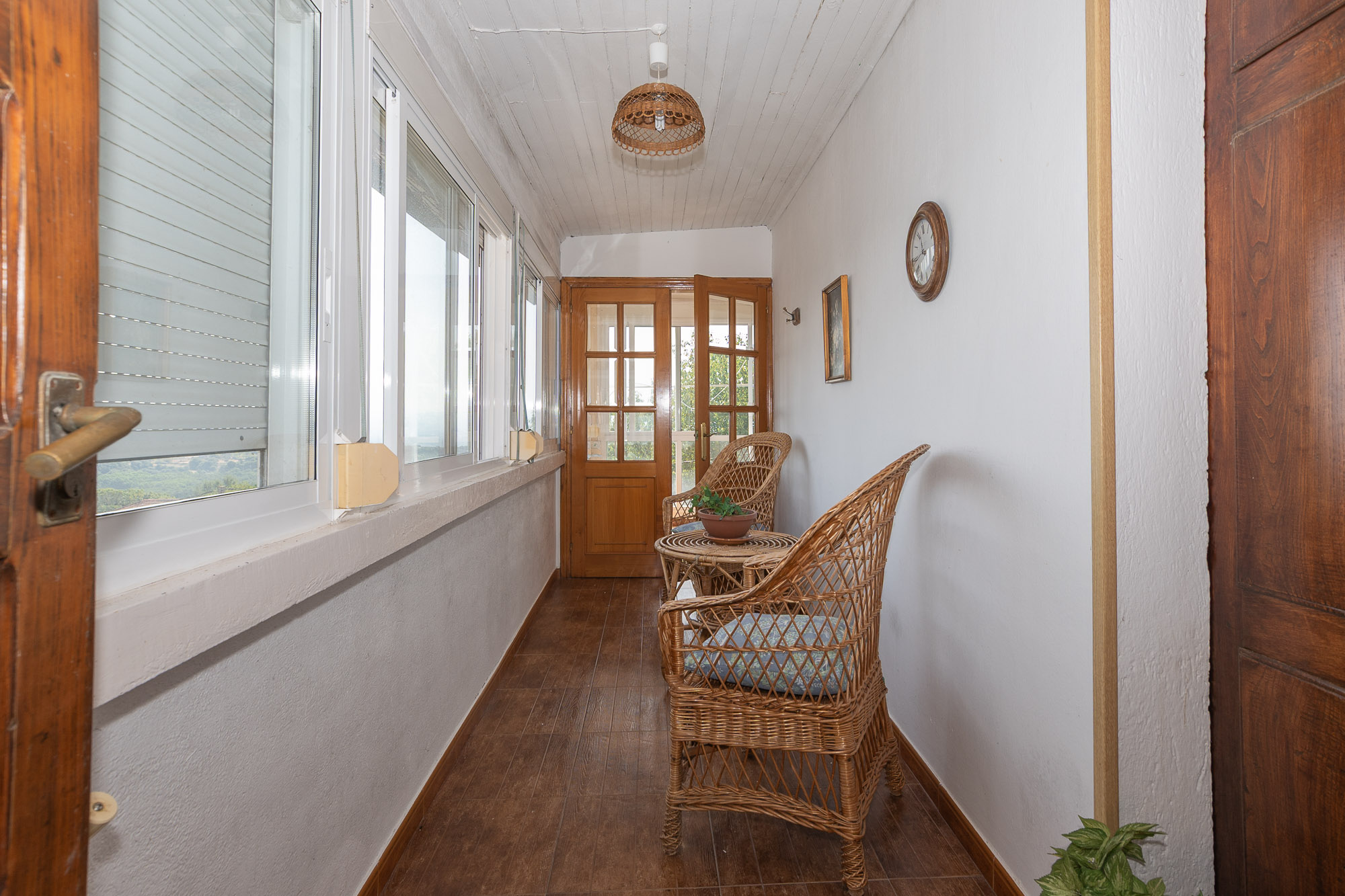 The upper floor, accessible via exterior stairs, contains the living spaces and is ready to move into. It has 4 bedrooms, a fully equipped kitchen, two complete bathrooms, a living-dining room and two glazed galleries that run along the facades. These galleries, equipped with large windows and converted into relaxation areas, offer panoramic views of the landscape.