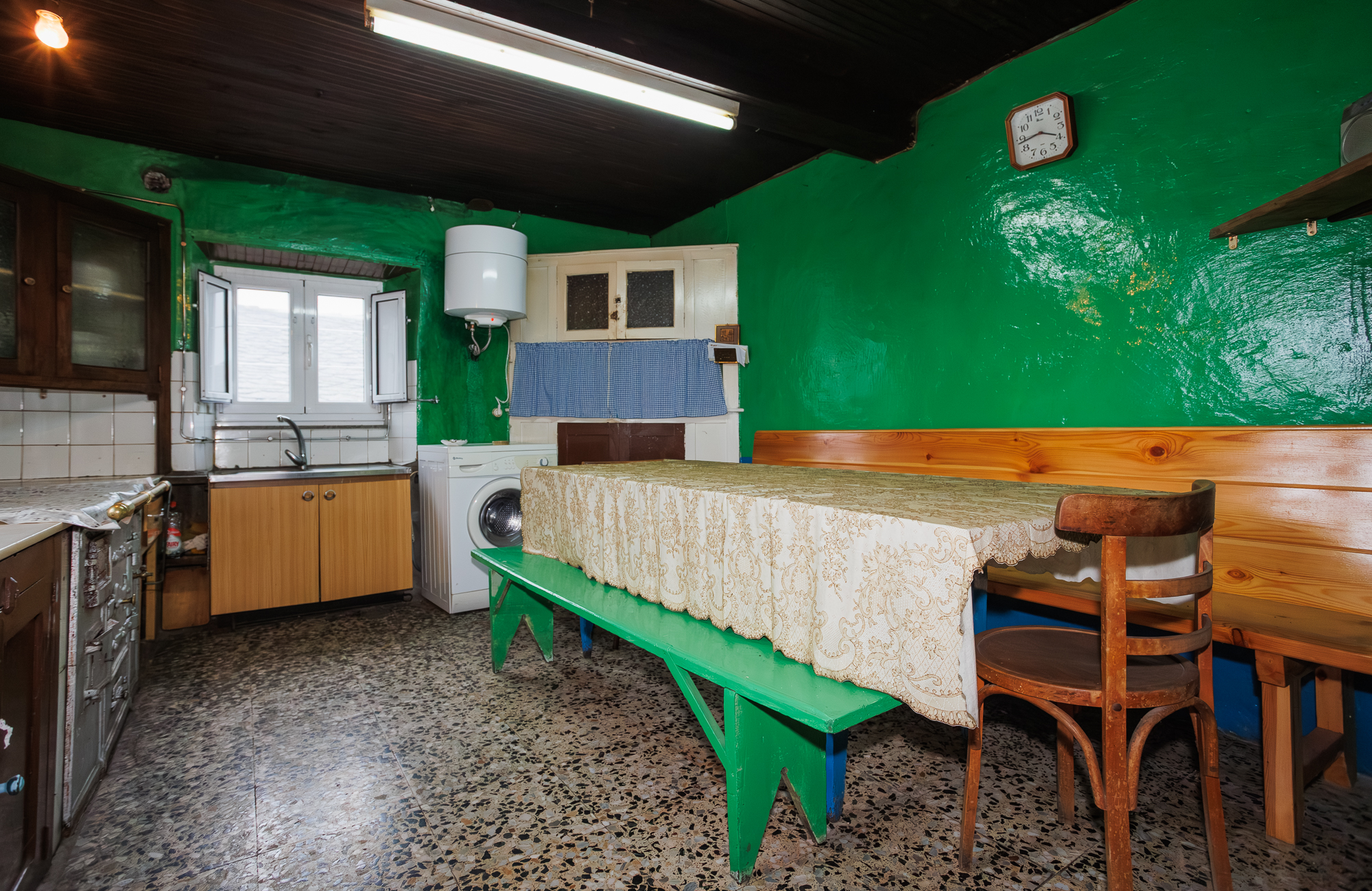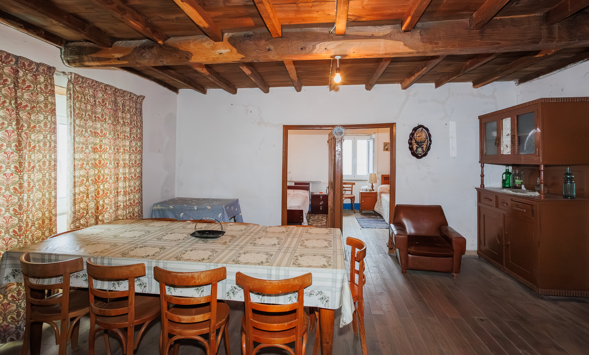 Access to the dwelling is through an exterior stone staircase that leads directly to the first floor, where the living spaces are distributed. This floor houses a kitchen equipped with a traditional wood-burning stove, a living room, six bedrooms, a complete bathroom with bathtub and a pantry. Additionally, it features a large dining-living room with generous proportions that acts as the central space of the dwelling.