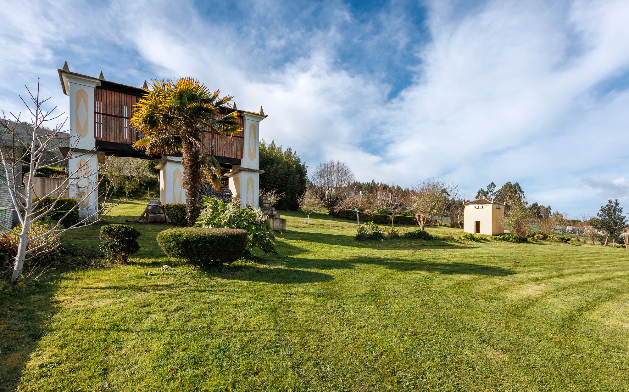 The traditional Galician hórreo, with its decorated white columns and timber structure, is one of the most distinctive features of the estate. Facing it stands the dovecote, a singular square-plan construction with a yellow rendered facade — matching the main house — and a tiled roof with pointed corner finials. Both structures are in perfect condition and add considerable heritage and aesthetic value to the property.