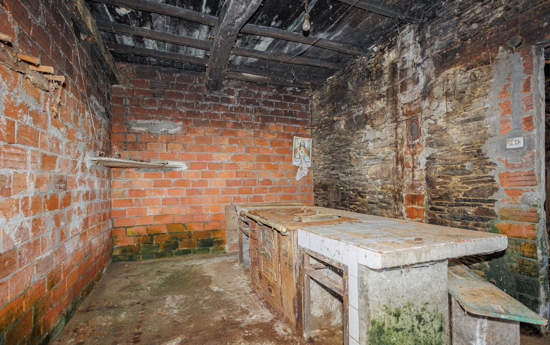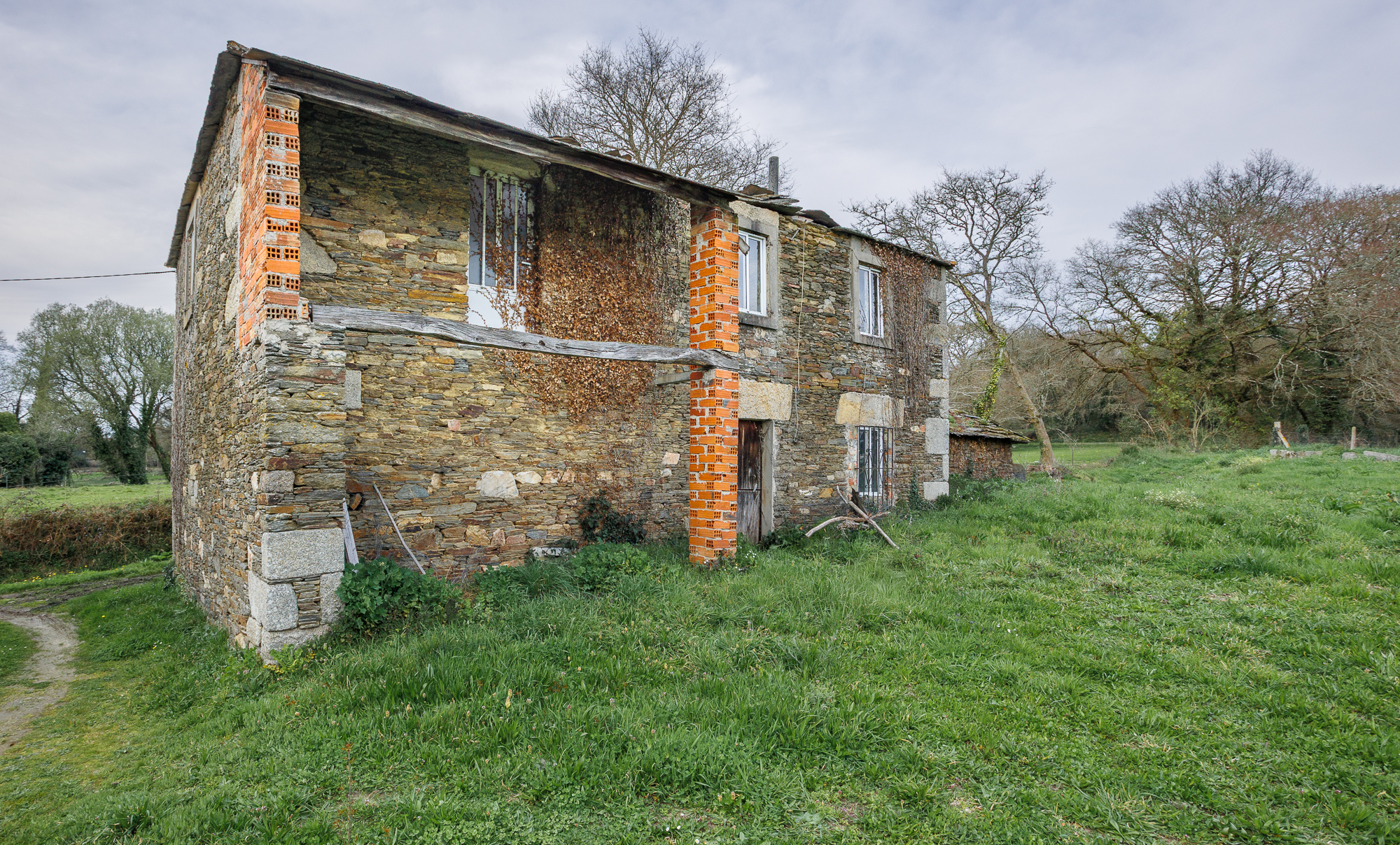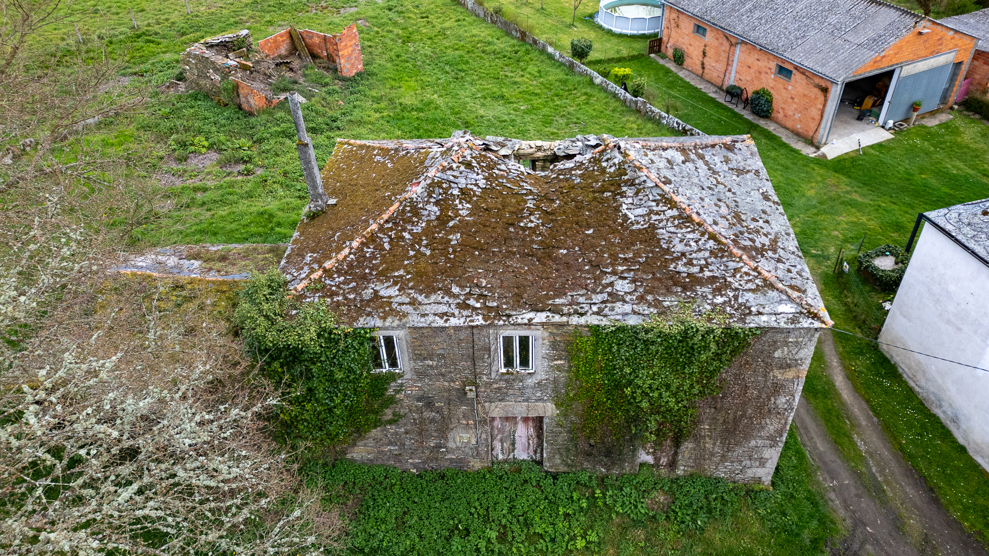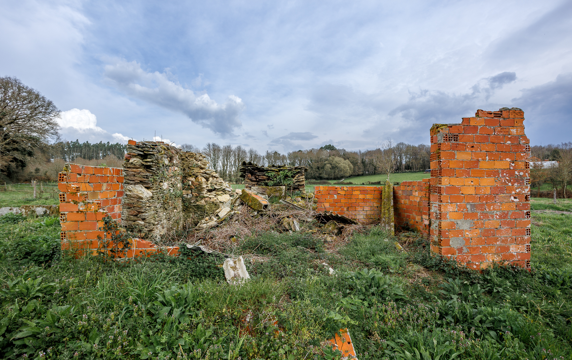 Outside the main plot stand the remains of an old outbuilding, made up of brick and stone walls in very poor condition. Among these ruins, a traditional wood-fired oven is preserved — a characteristic feature of rural Galician architecture.