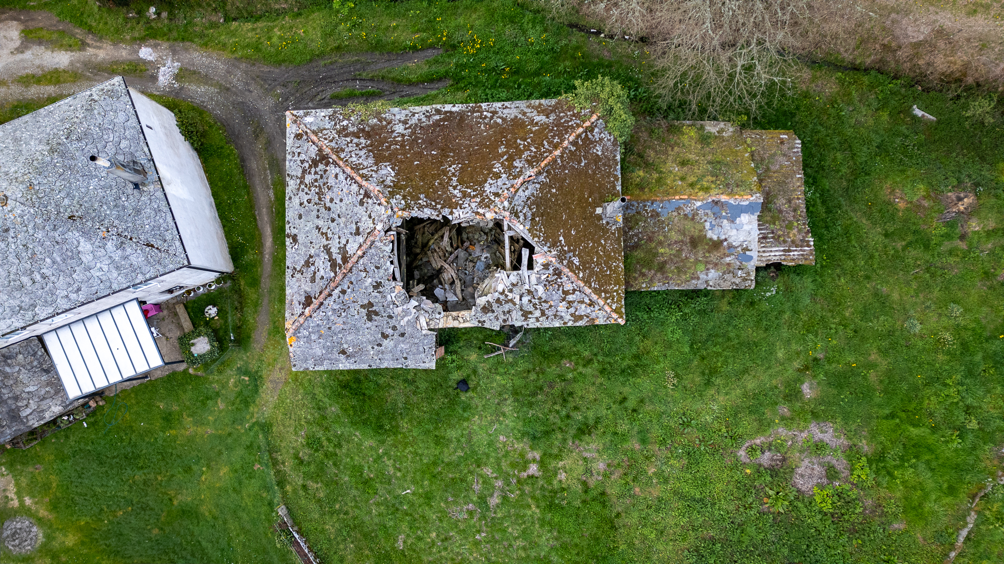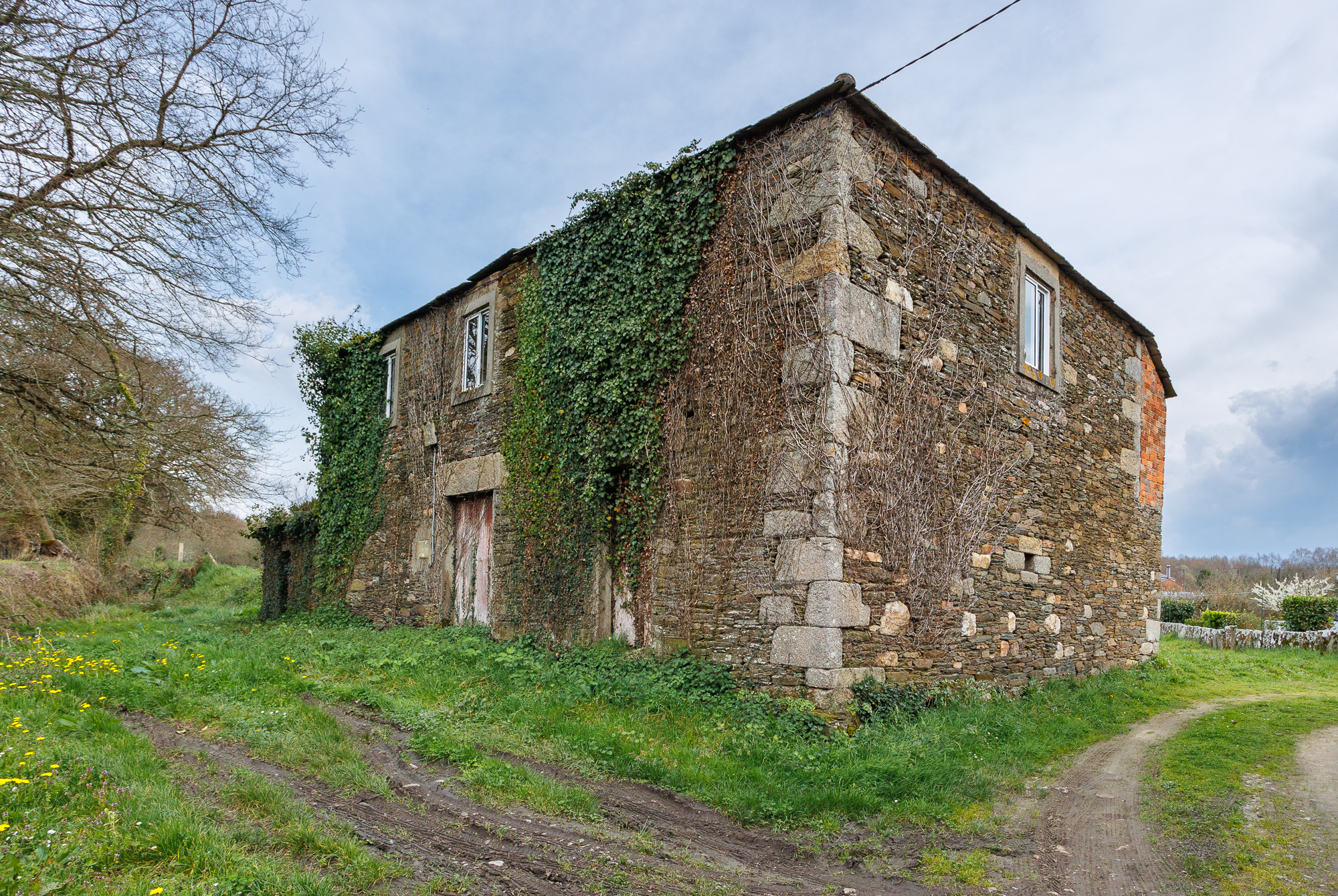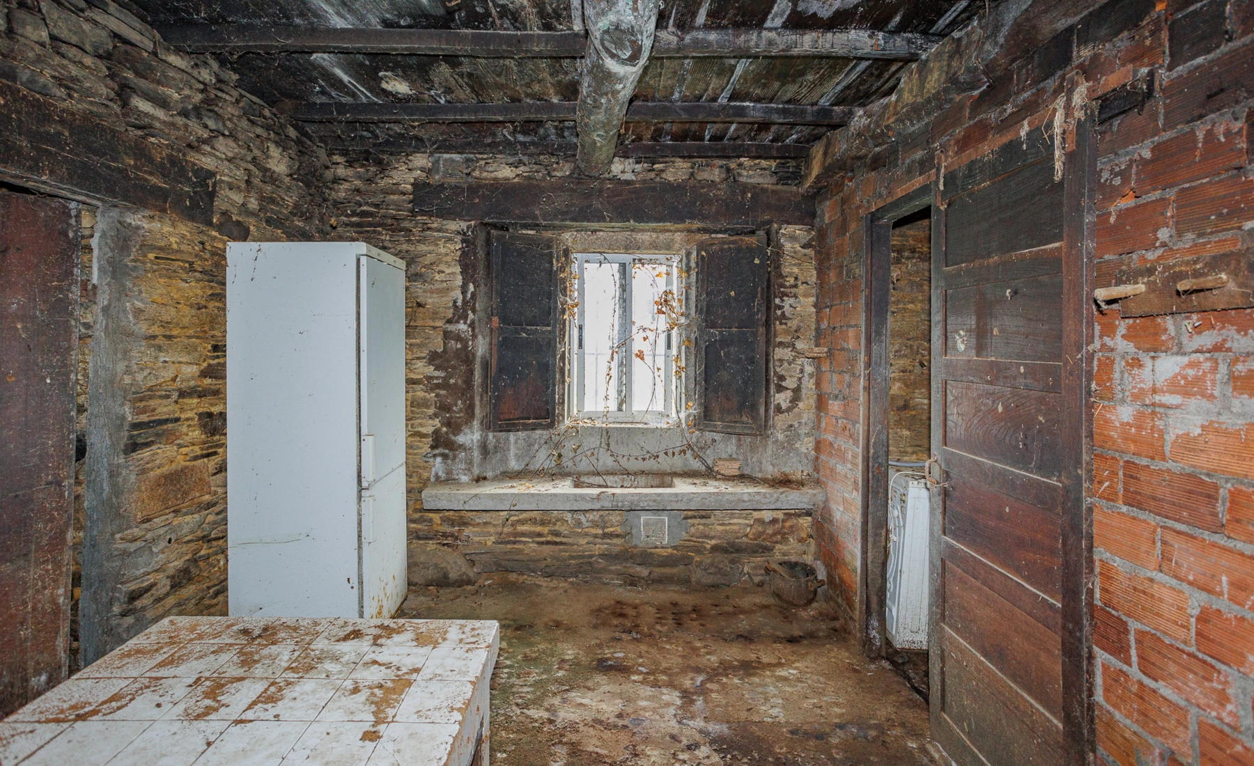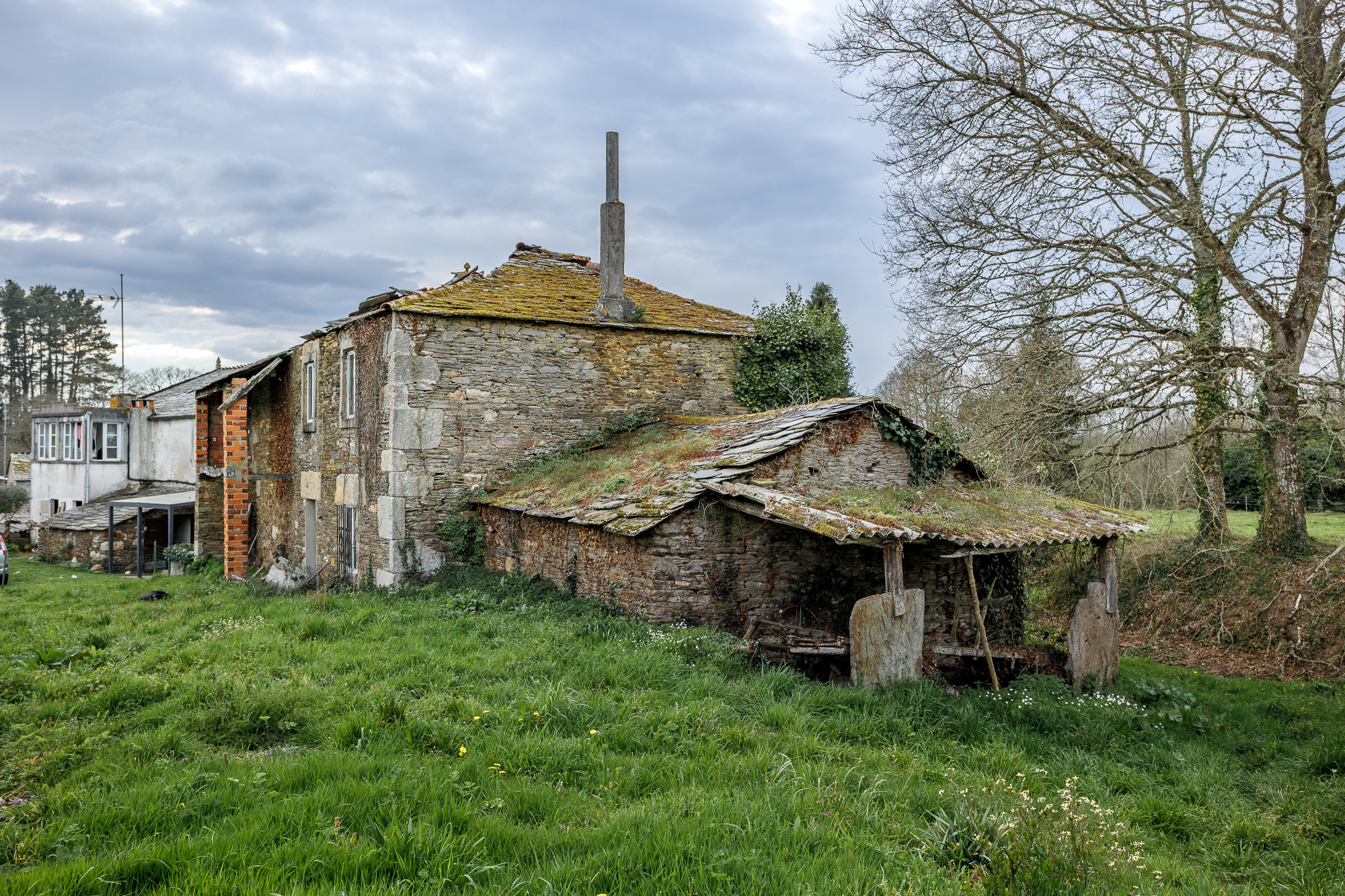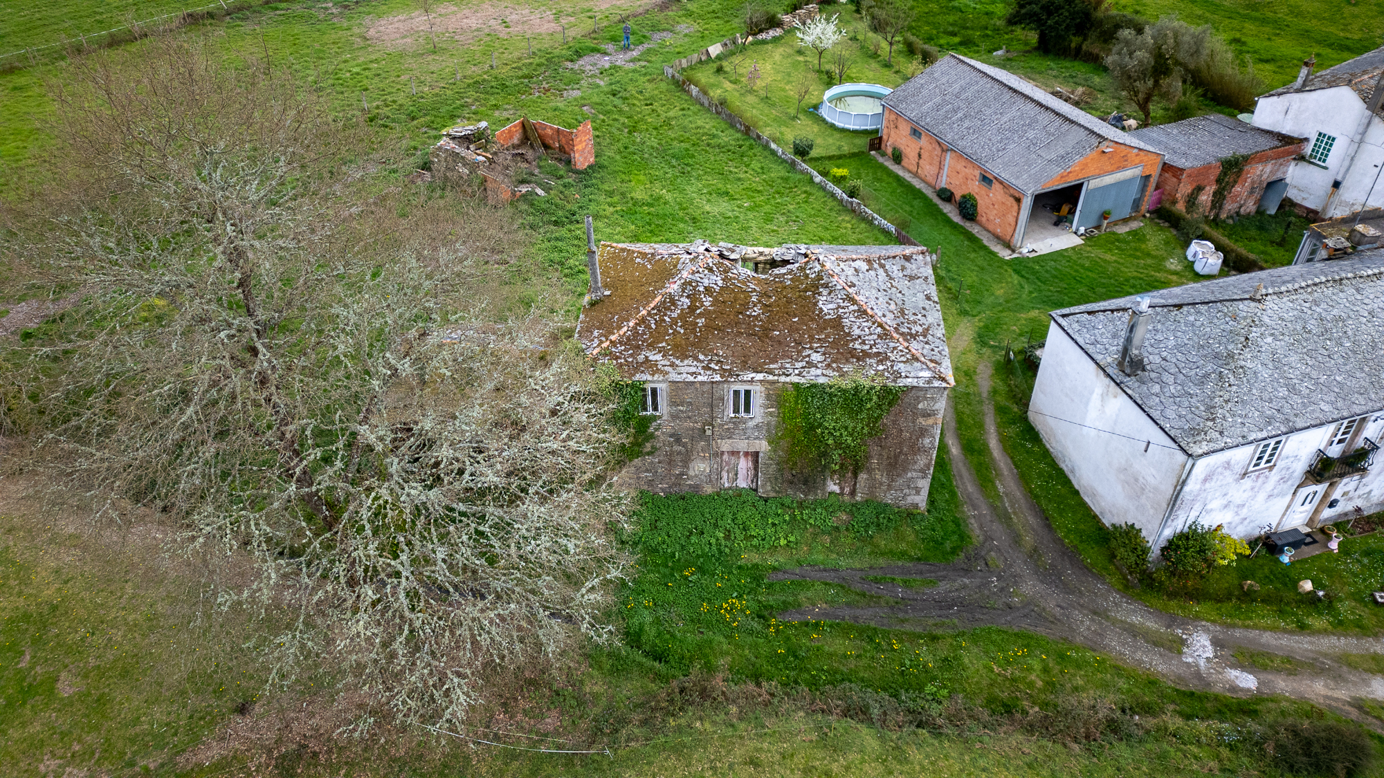 Outside the main plot stand the remains of an old outbuilding, made up of brick and stone walls in very poor condition. Among these ruins, a traditional wood-fired oven is preserved — a characteristic feature of rural Galician architecture.