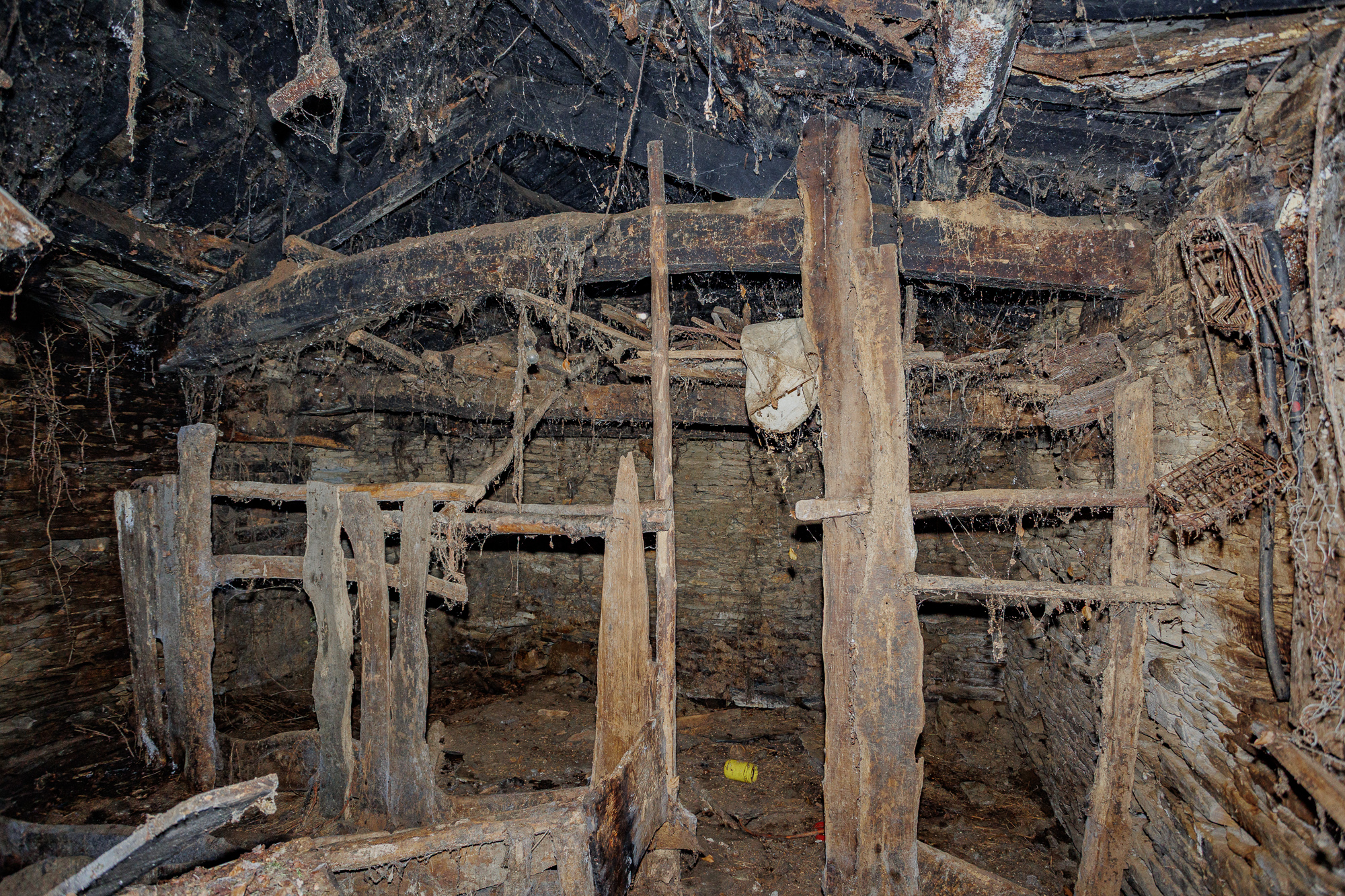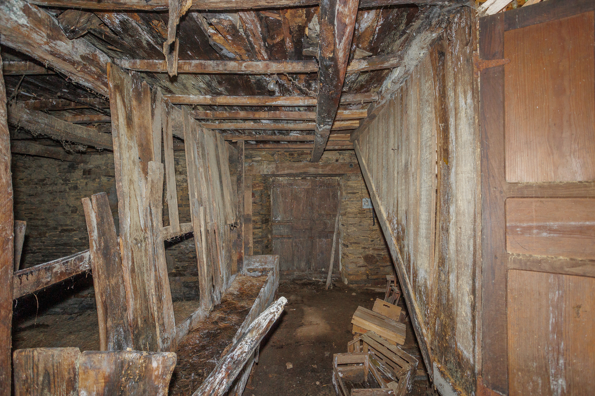 The ground floor contains an old kitchen and two former stables, spaces that retain part of their original timber beam structure and exposed stone walls, partially completed with brick. The upper floor is an open-plan space, virtually undivided, offering total freedom to configure the layout according to the requirements of the project.