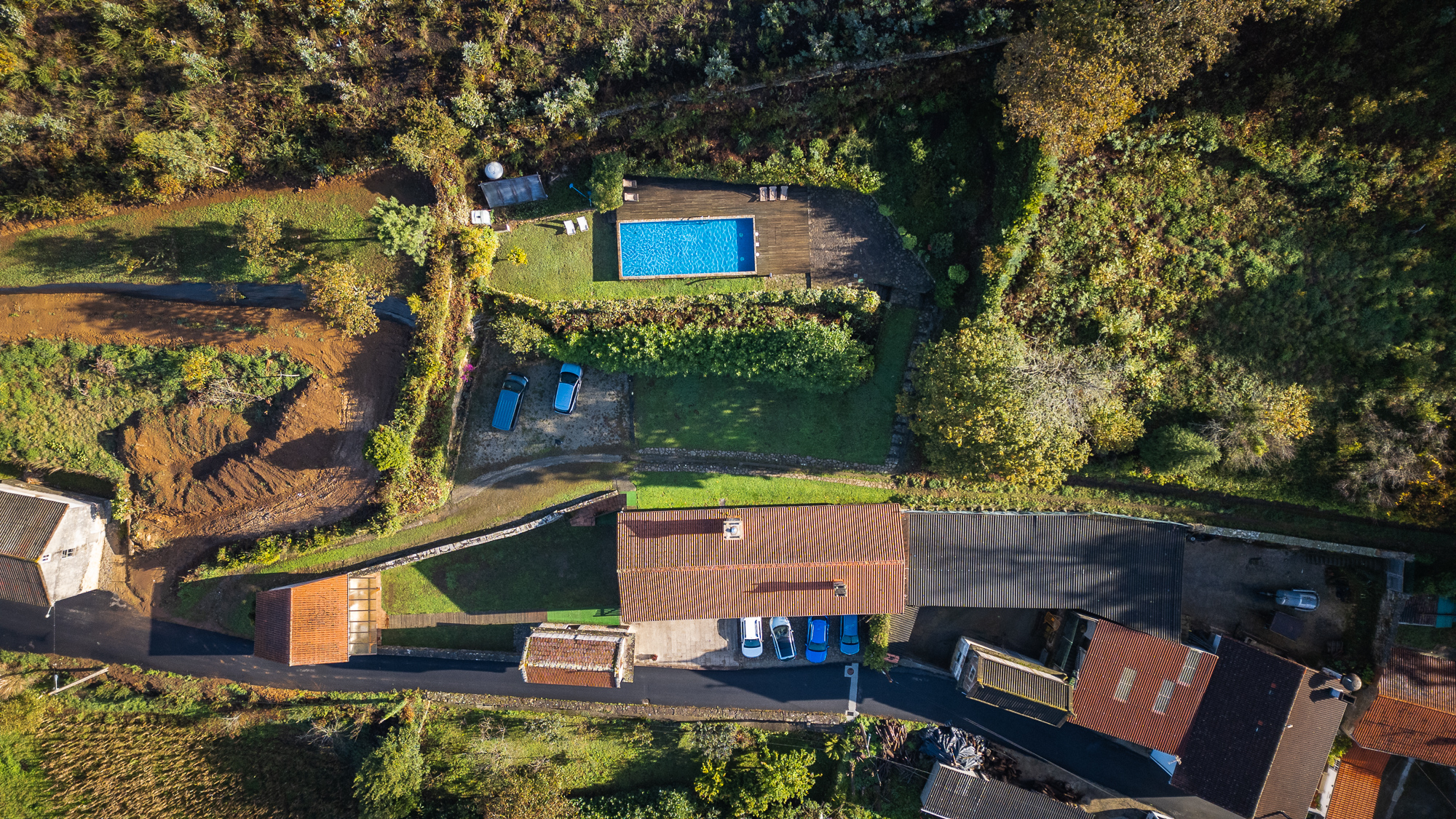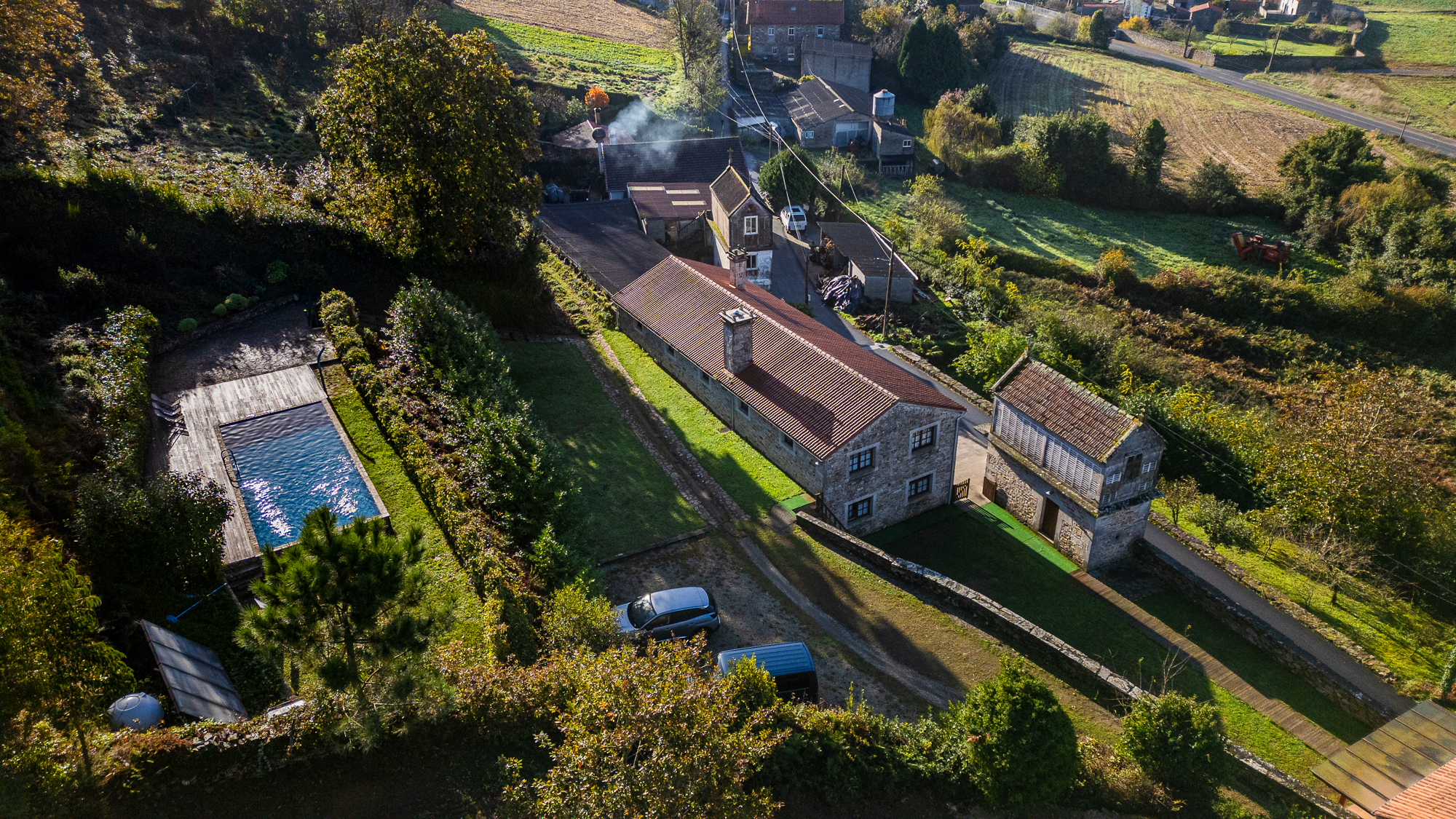 El conjunto está formado por una casa principal de piedra completamente restaurada, una casa adicional más pequeña, un hórreo con almacén, piscina, aparcamiento y varias zonas ajardinadas, conformando un complejo turístico completo listo para acoger hasta 16 huéspedes.