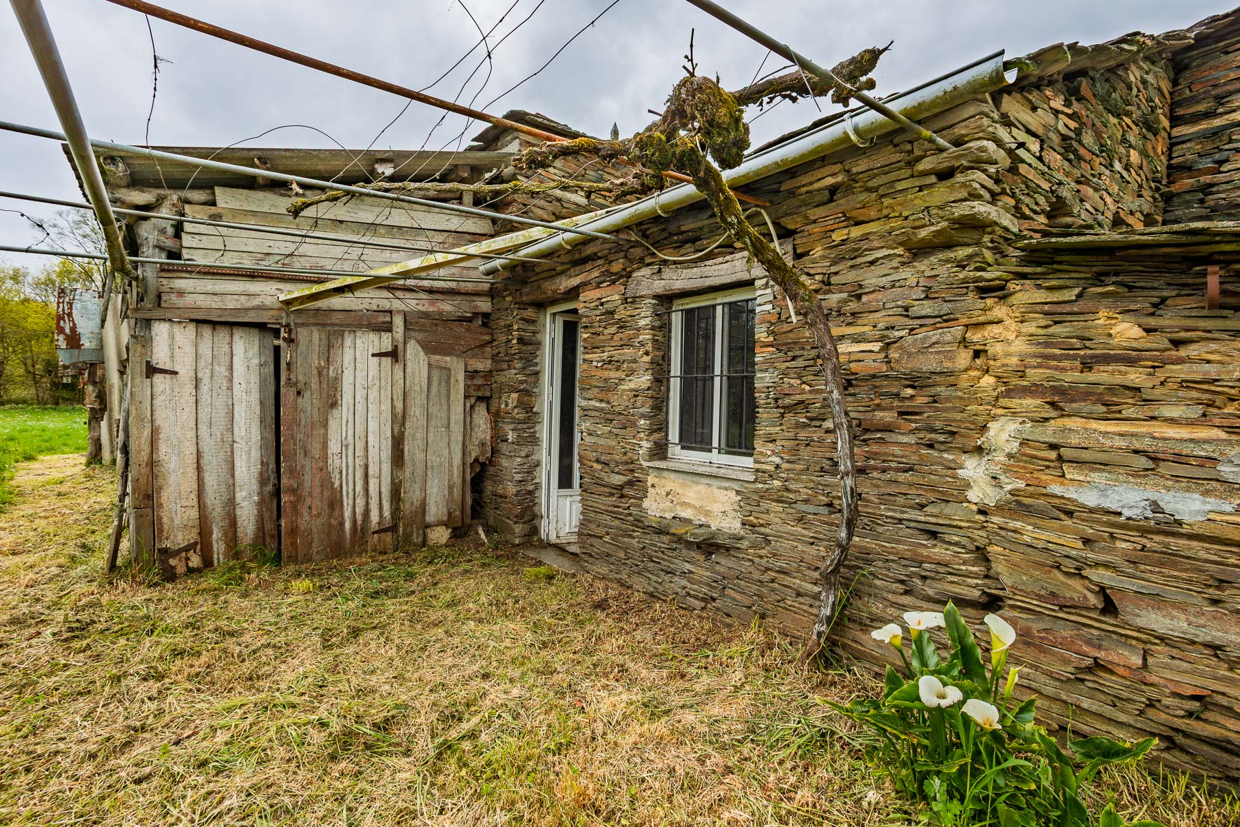 Adosados a la vivienda principal se encuentran dos amplios alpendres-garajes construidos con la misma piedra tradicional, perfectos para usar como taller, zona de almacenamiento o para transformarlos según las necesidades del nuevo propietario. Frente a la casa, un pozo tradicional con estructura de piedra dota de suministro de agua a la propiedad.