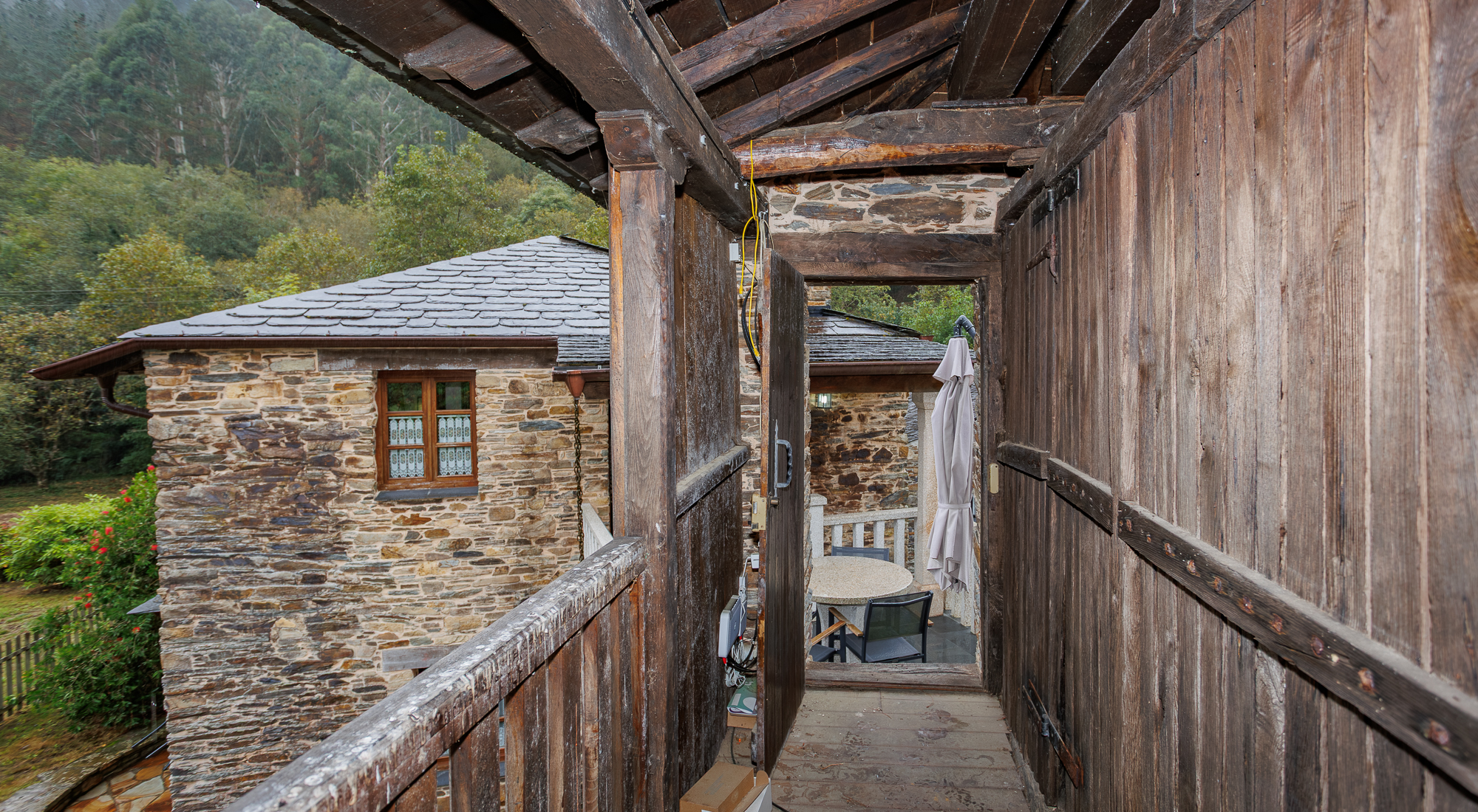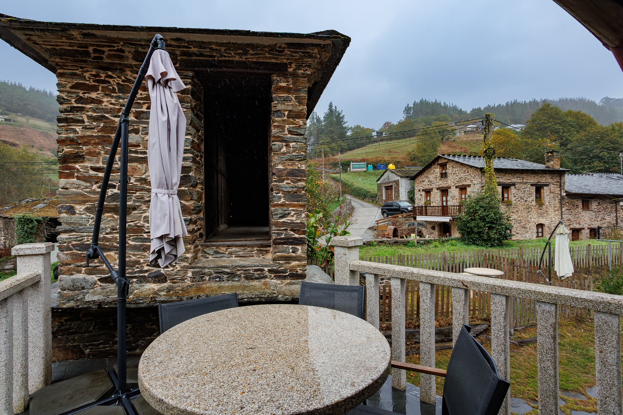 El apartamento de la planta superior dispone de salón-cocina, dos habitaciones y cuarto de baño con ducha, además de una pequeña terraza con mesa y sillas junto al hórreo elevado que enmarca el acceso a la propiedad.