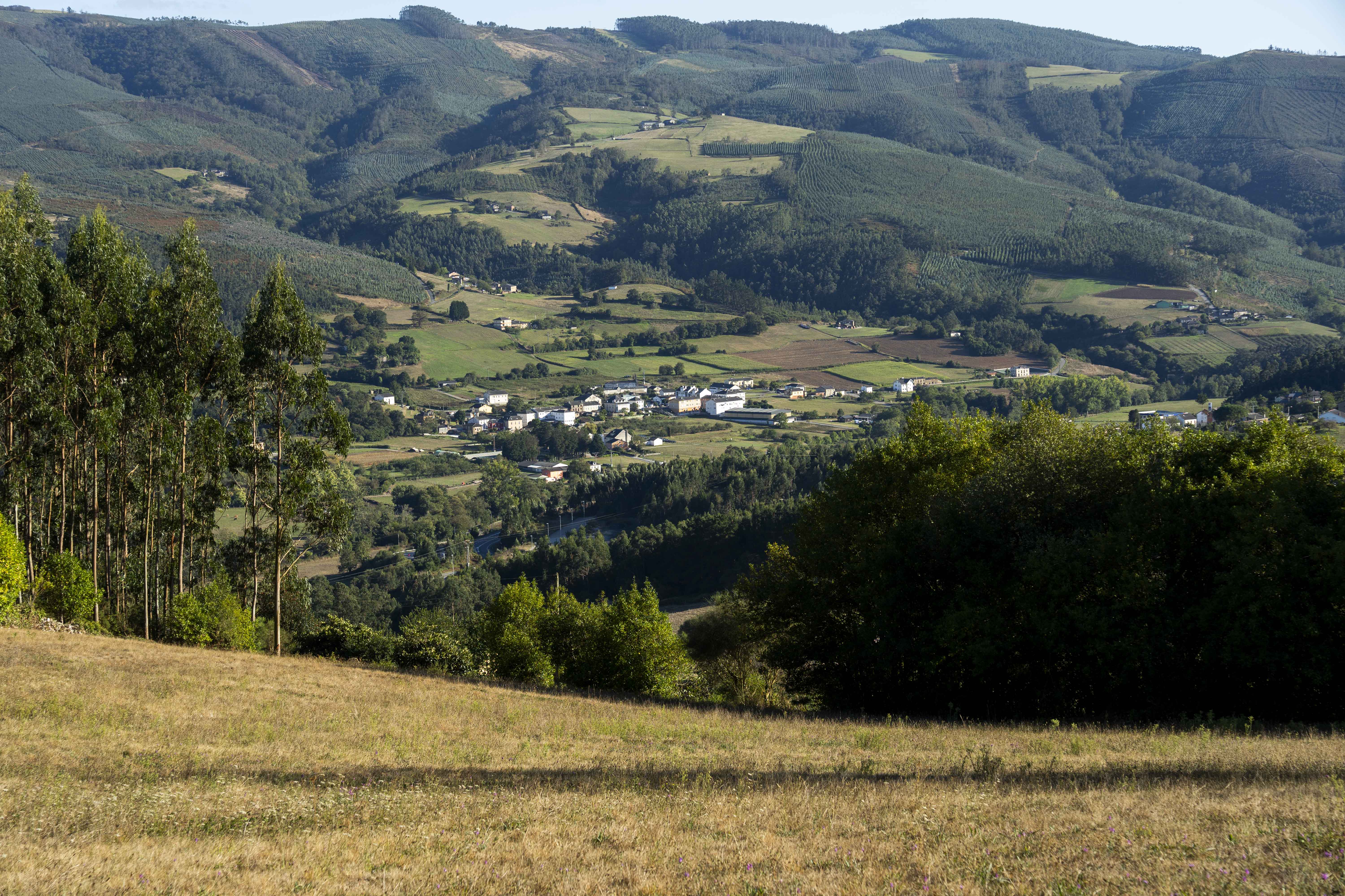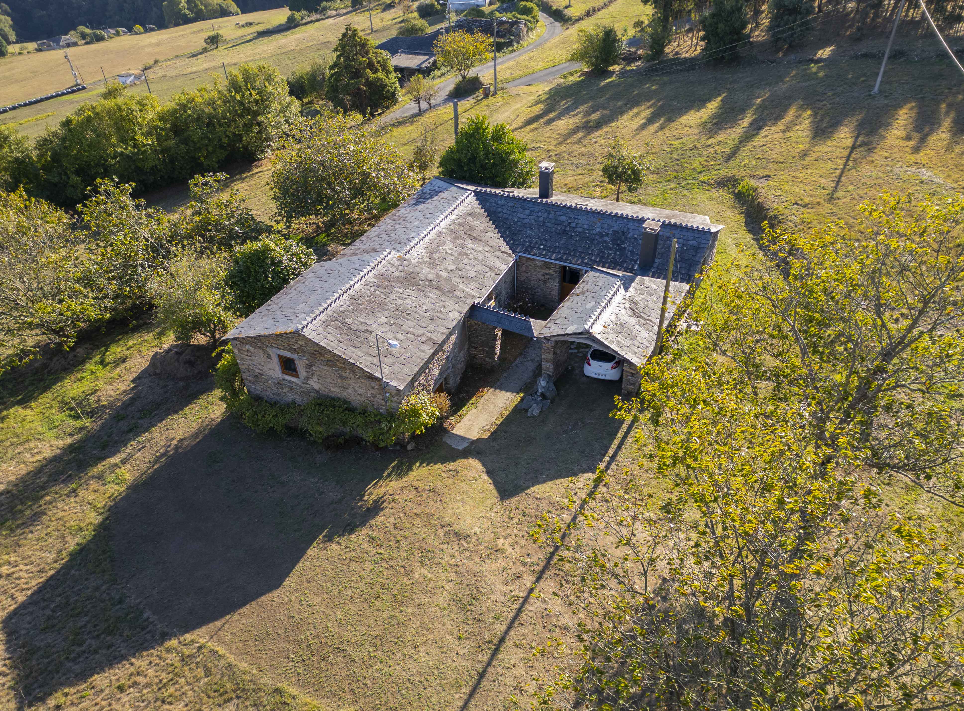 Desde su posición ligeramente elevada sobre el paisaje, la propiedad ofrece vistas al pueblo de San Tirso de Abres y al valle circundante, con las montañas características de la zona enmarcando el horizonte.