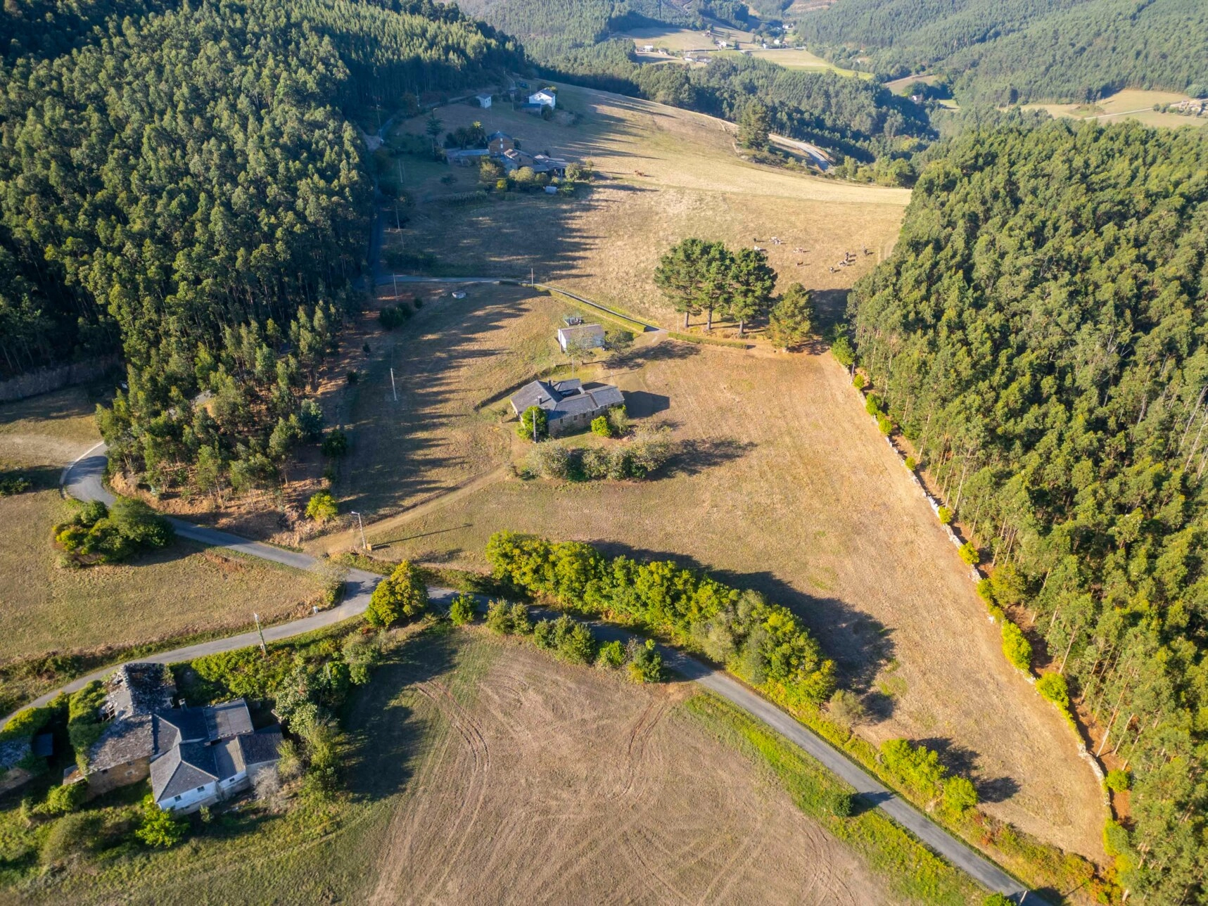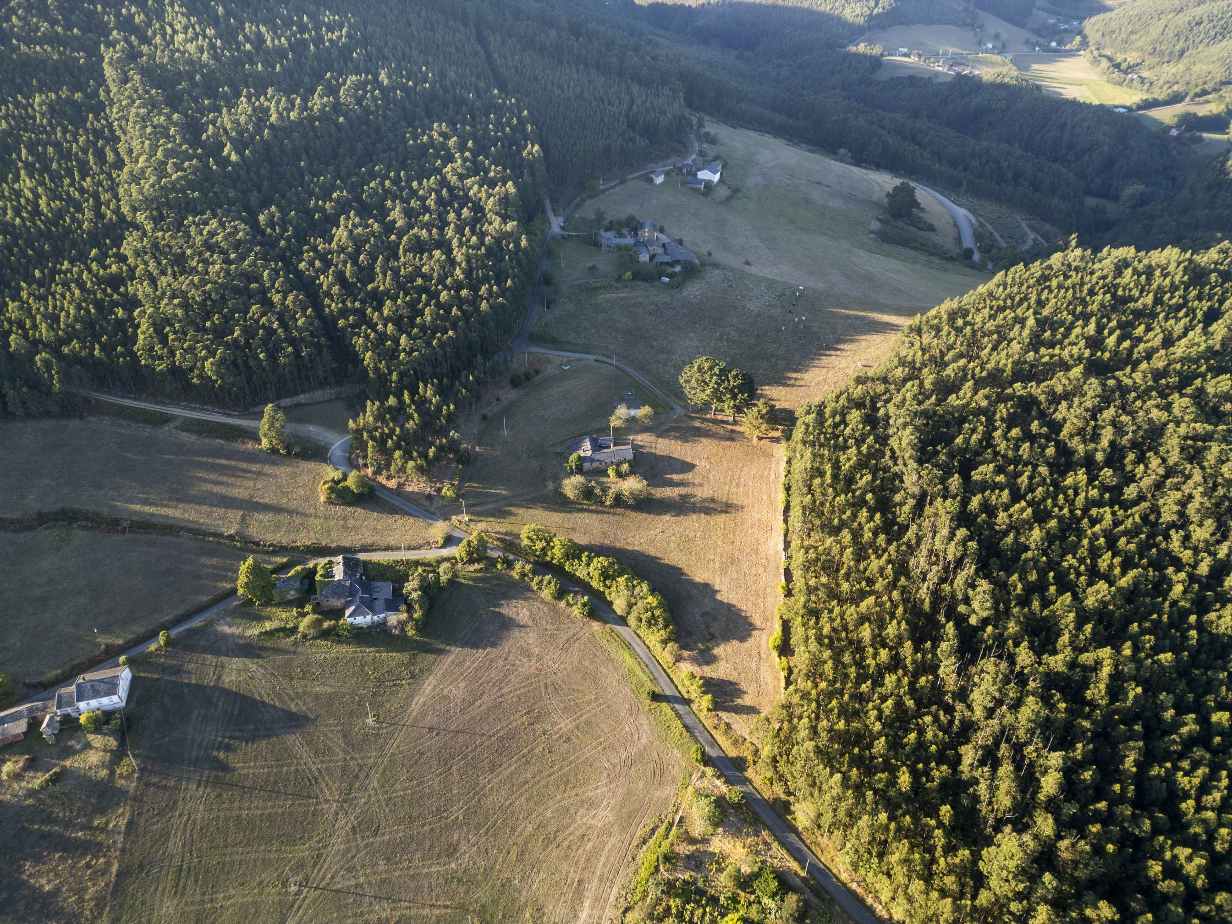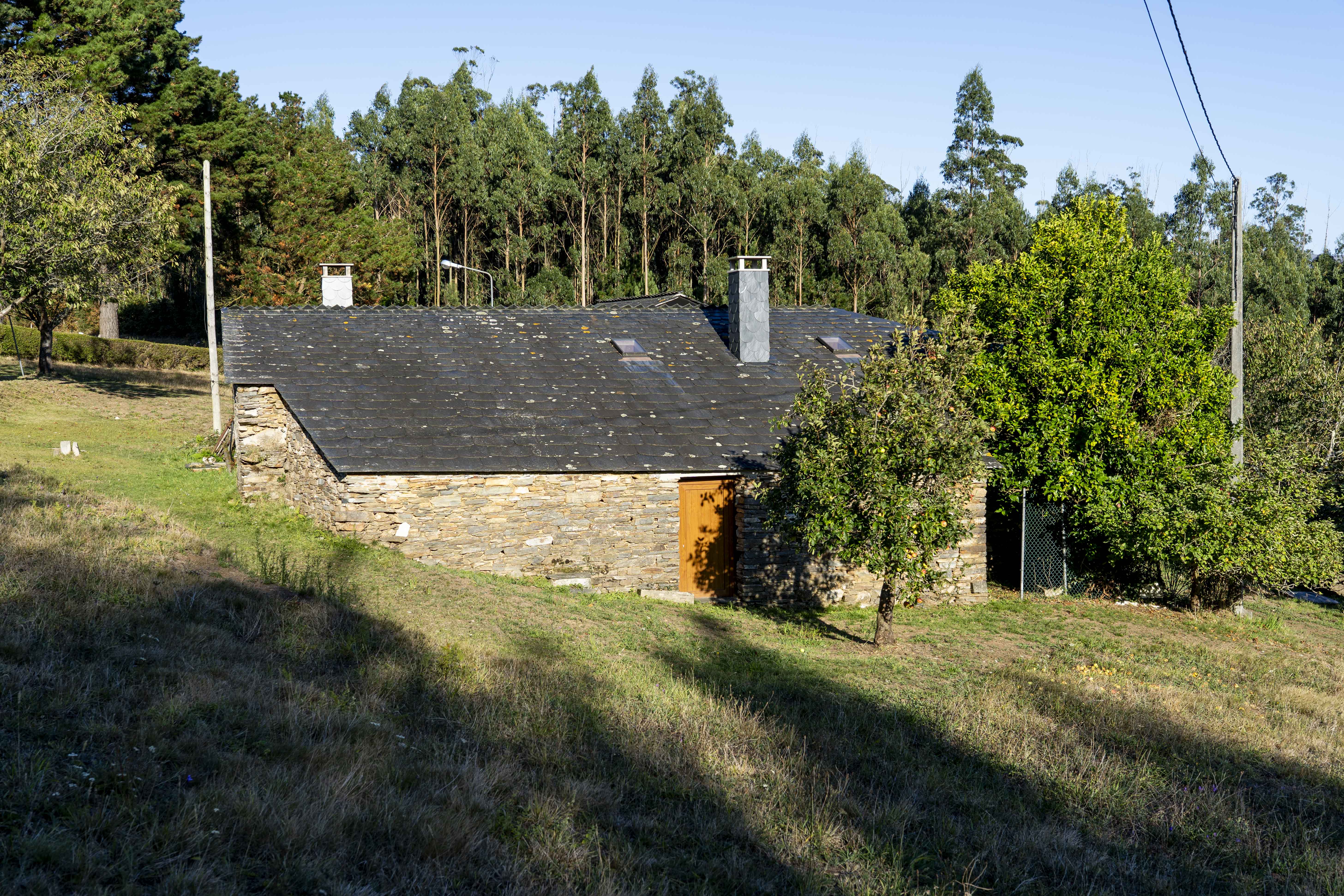 Las parcelas situadas en ambos extremos de la finca albergan plantaciones de eucaliptos, siendo la más grande del año 2012, lo que ofrece potencial de rentabilidad inmediata. El terreno que rodea las construcciones está despejado en su mayor parte, si bien cuenta con árboles frutales como manzanos, cerezos e higueras, además de una camelia, hortensias y un conjunto de laureles junto a la carretera.