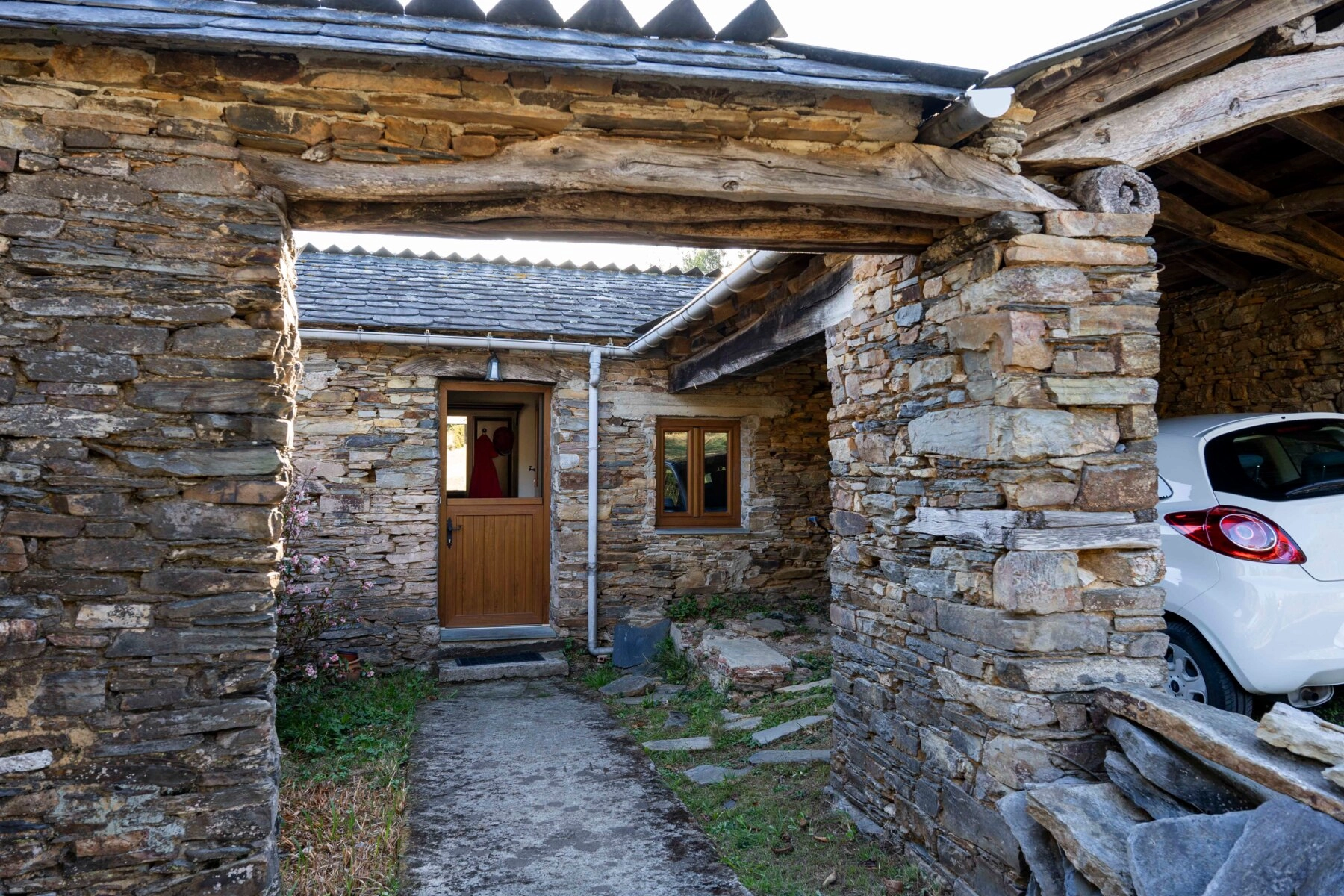 La construcción, cuyo tejado se encuentra en excelente estado, cuenta con un garaje abierto anexo a la estructura en forma de L, conformando un pequeño patio alrededor de la entrada principal.