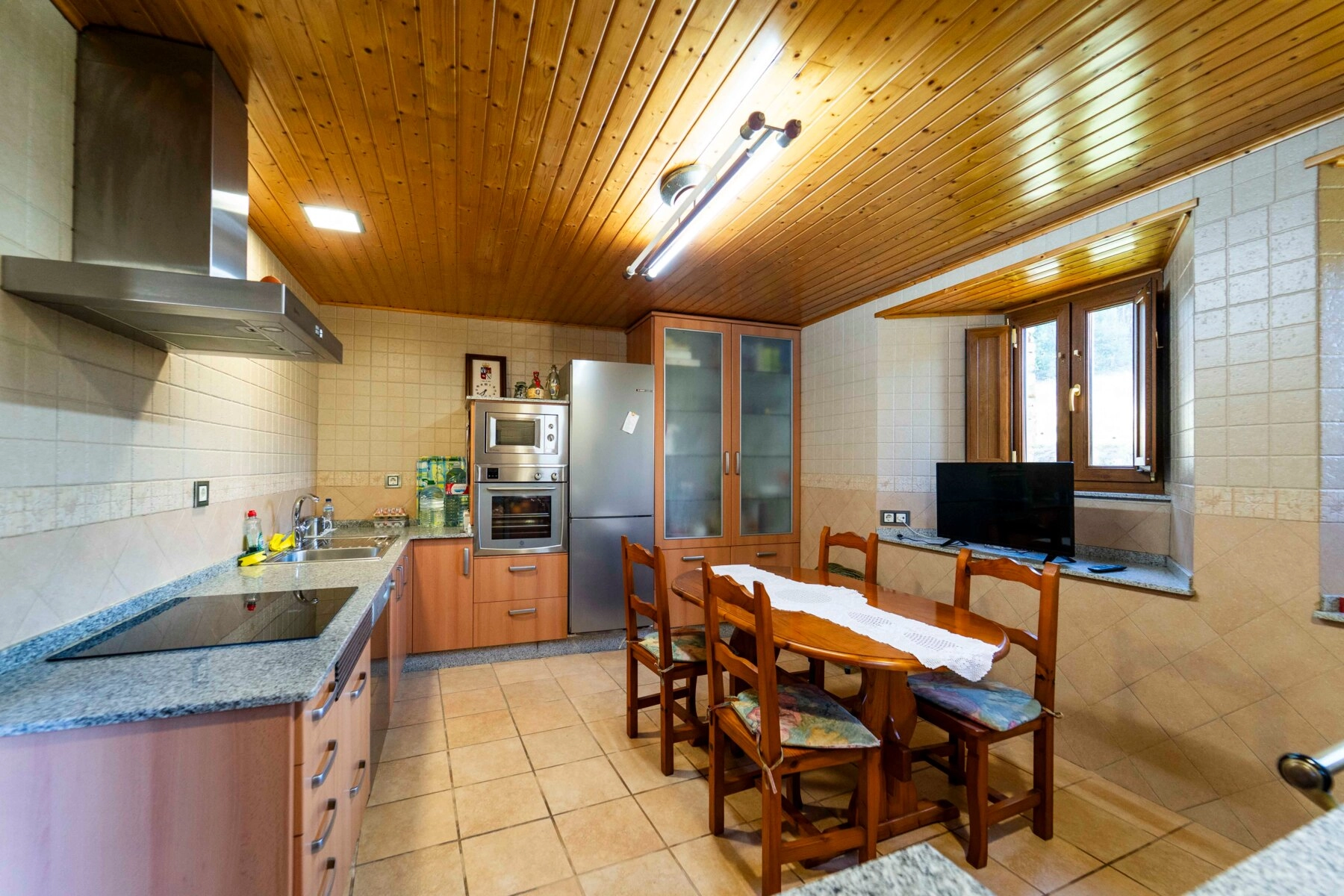 Esta entrada conduce directamente a la parte reformada, que incluye un recibidor, una cocina completamente equipada con electrodomésticos modernos, cocina tradicional de leña y zona de comedor, un salón con chimenea, dos dormitorios, un cuarto de lavandería y un cuarto de baño completo con acceso directo desde el dormitorio principal.