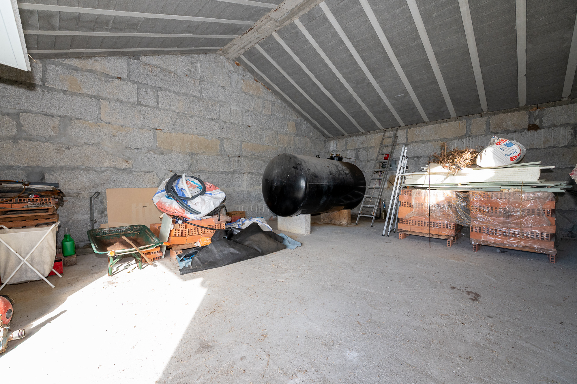 El conjunto se completa con una construcción auxiliar independiente situada en una esquina de la propiedad, donde se encuentra el depósito de gasóleo, que resulta ideal como espacio adicional de almacenaje o para guardar vehículos o maquinaria. Una cancilla de forja da acceso al amplio terreno trasero, completamente llano y despejado. La propiedad dispone de pozo propio.