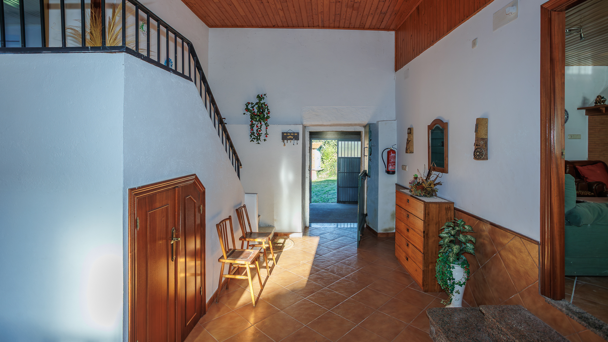 En el interior de la vivienda, un amplio hall sirve de acceso a los diferentes niveles y espacios, entre los que destaca una espaciosa cocina completamente amueblada que concentra las principales zonas de convivencia del hogar. Esta estancia incluye una lareira tradicional, un horno de leña, una mesa de comedor y una zona de estar equipada con dos grandes sofás.