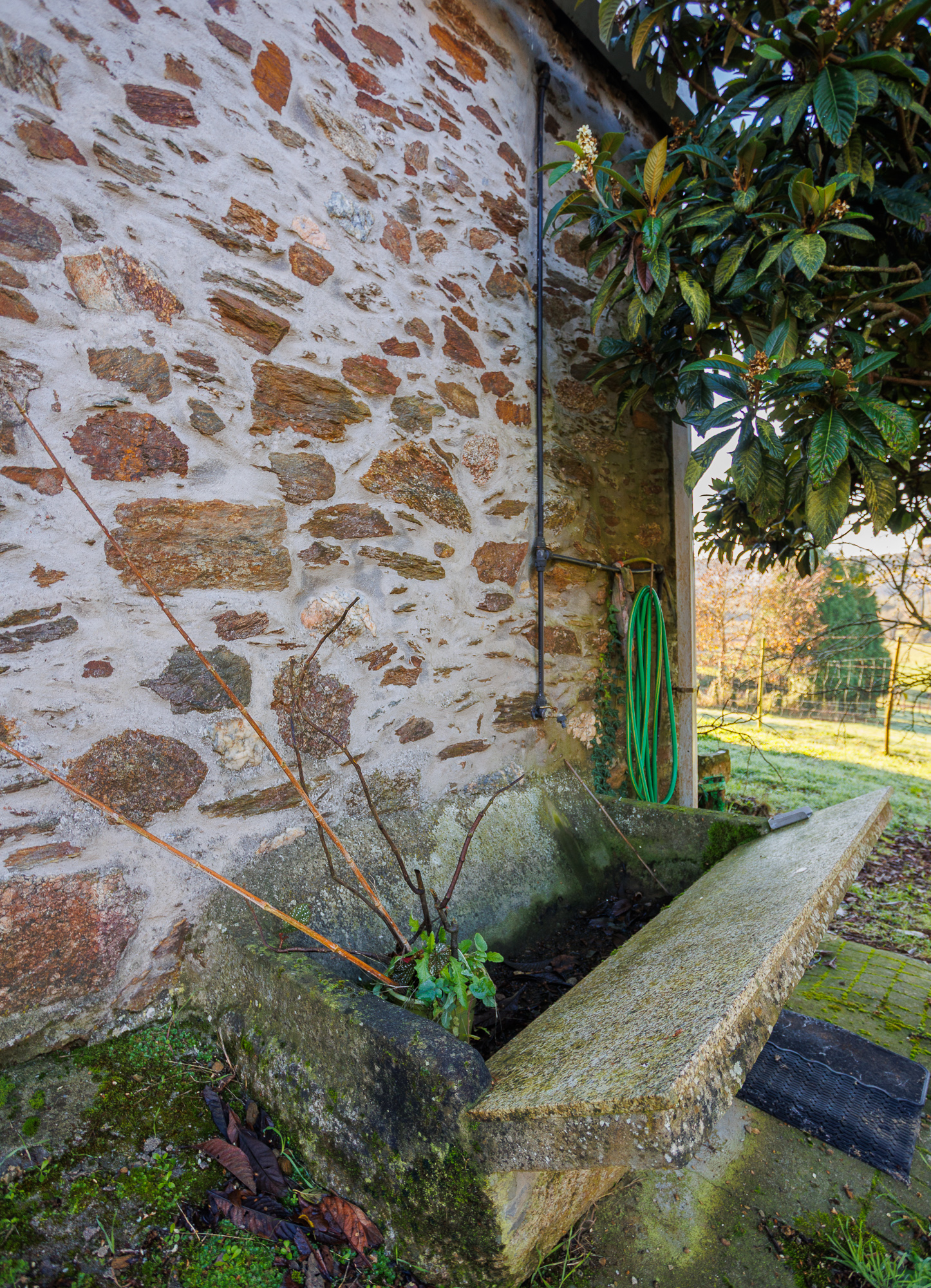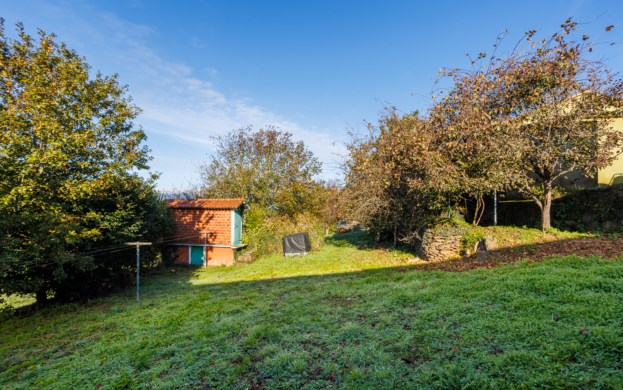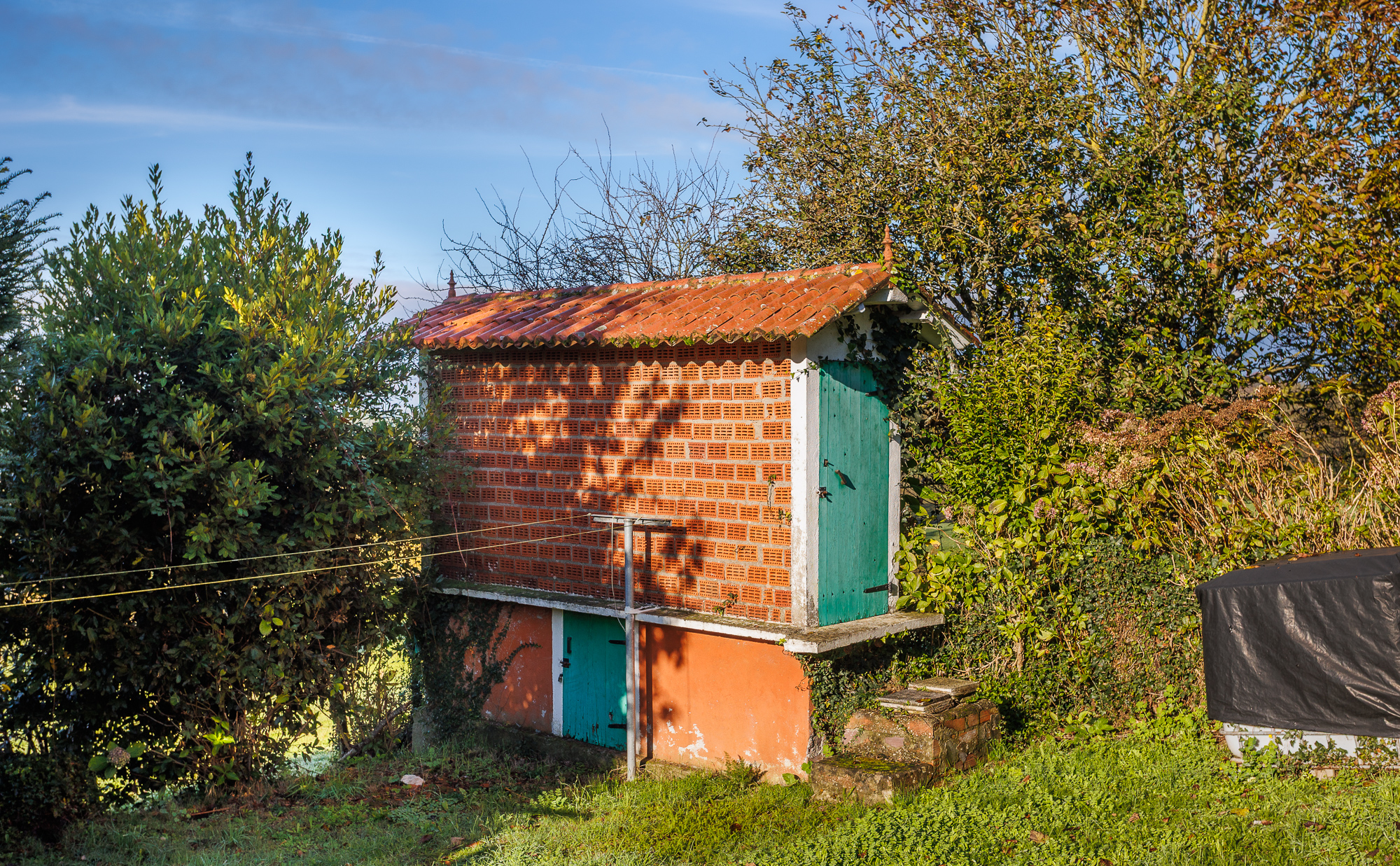 Frente a la casa, a pocos metros, se encuentra otra estructura que sirve como garaje y cuenta con un rincón habilitado como taller. El conjunto se completa con un hórreo, elemento característico de la arquitectura rural de Galicia, un pequeño lavadero y una zona de huerta.