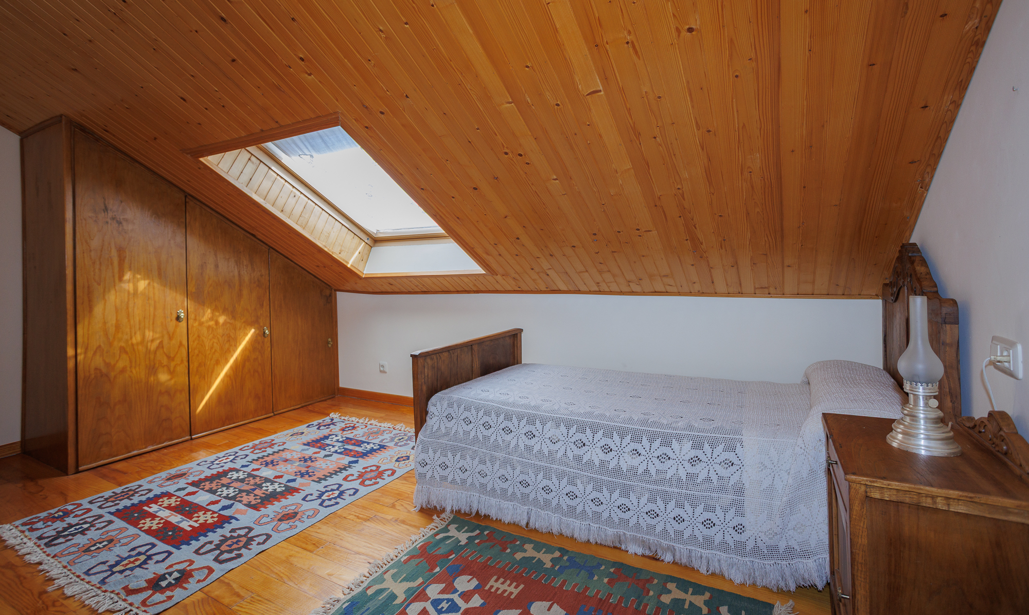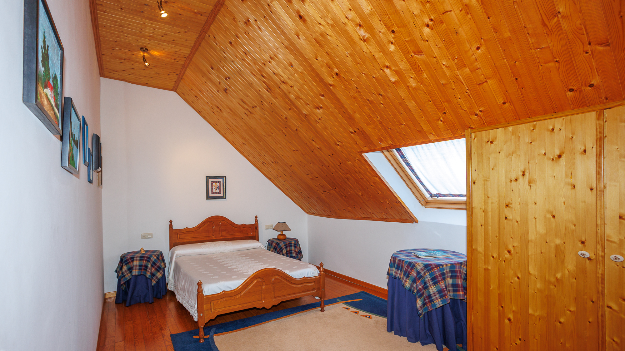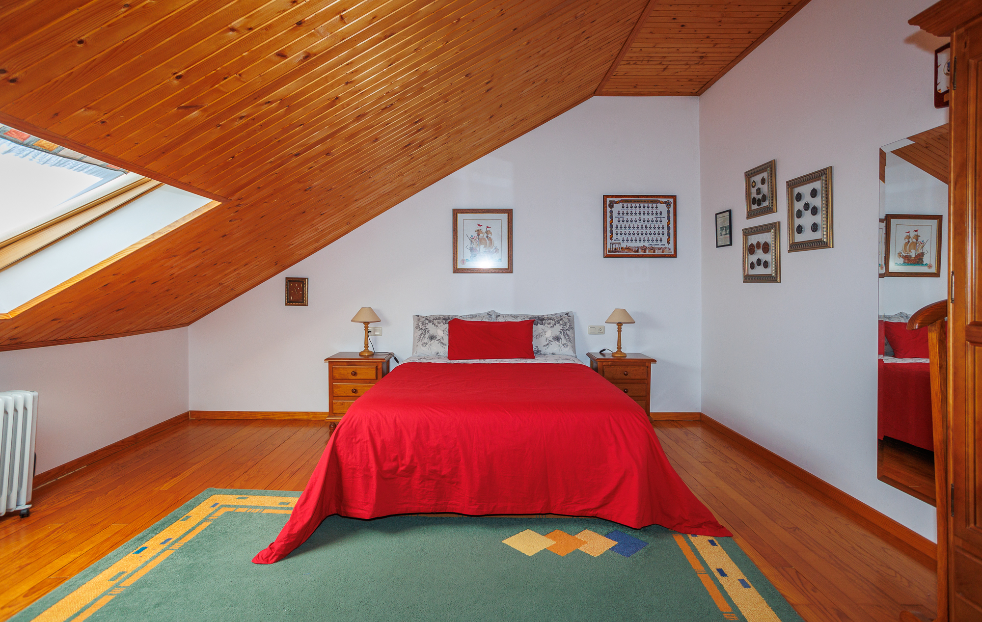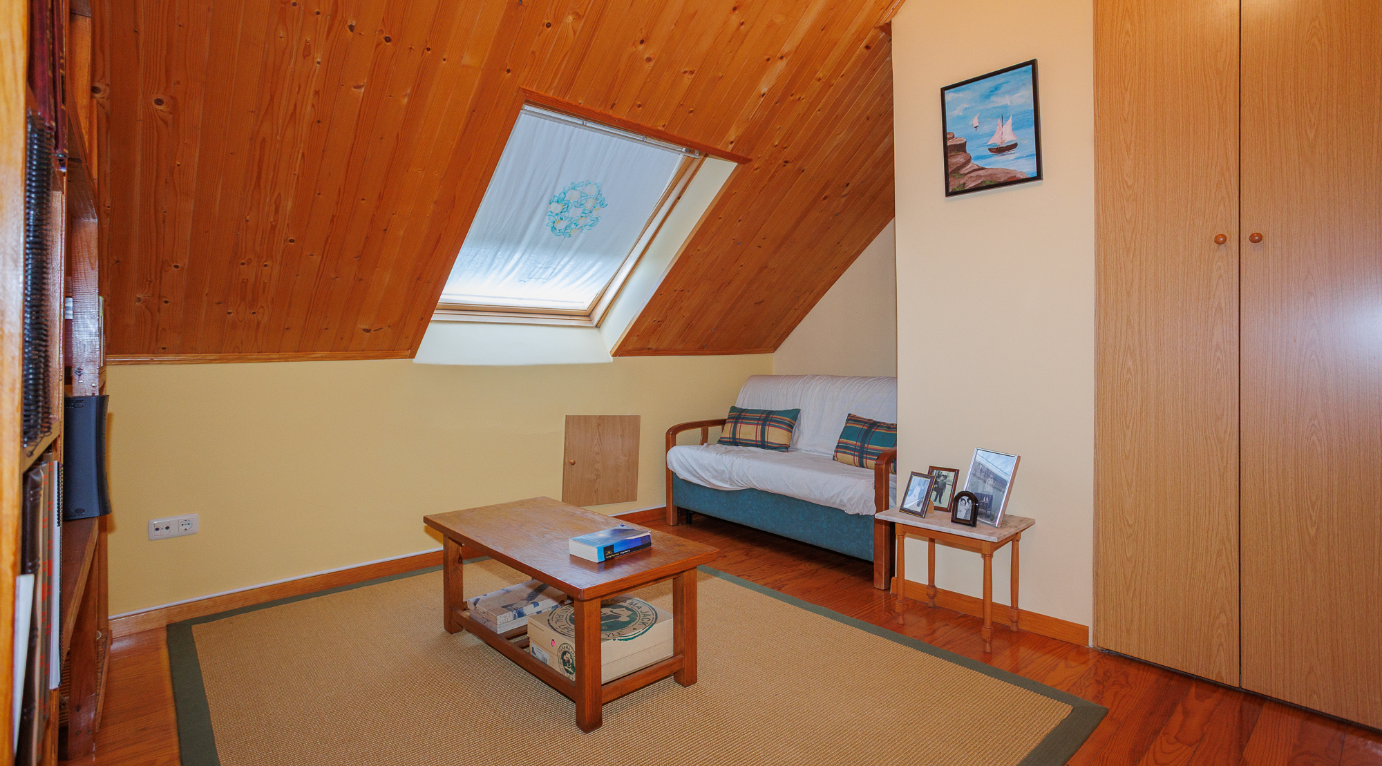 La bajocubierta alberga tres dormitorios, una sala de estar y un baño completo con bañera, y destaca por sus techos de madera vista equipados con ventanas Velux que crean espacios acogedores y luminosos.