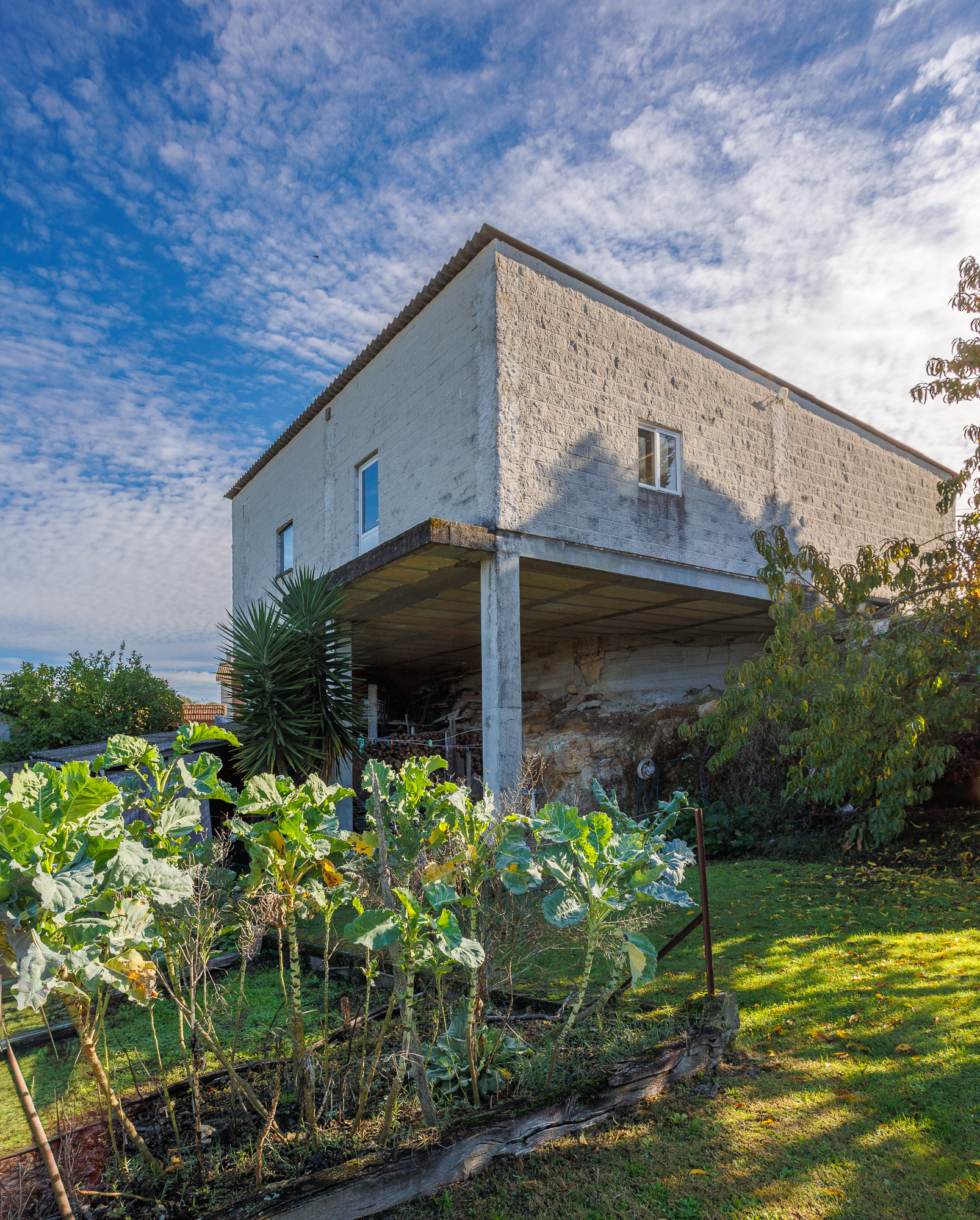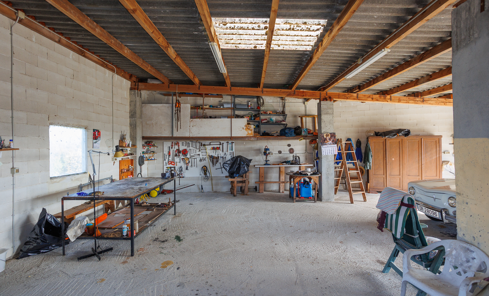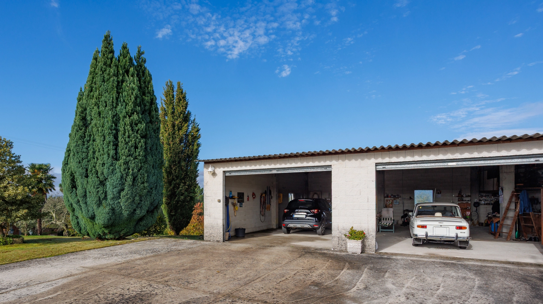 Separado de la casa se alza una segunda construcción independiente que aprovecha el desnivel del terreno ofreciendo espacios diferenciados en sus dos alturas. En la parte superior, al mismo nivel que la casa y orientado hacia la entrada principal de la finca, funciona como un gran garaje con capacidad para 6-8 vehículos, que incluye una espaciosa zona de taller. El nivel inferior, orientado hacia la parte trasera del jardín, funciona como almacén y leñera.