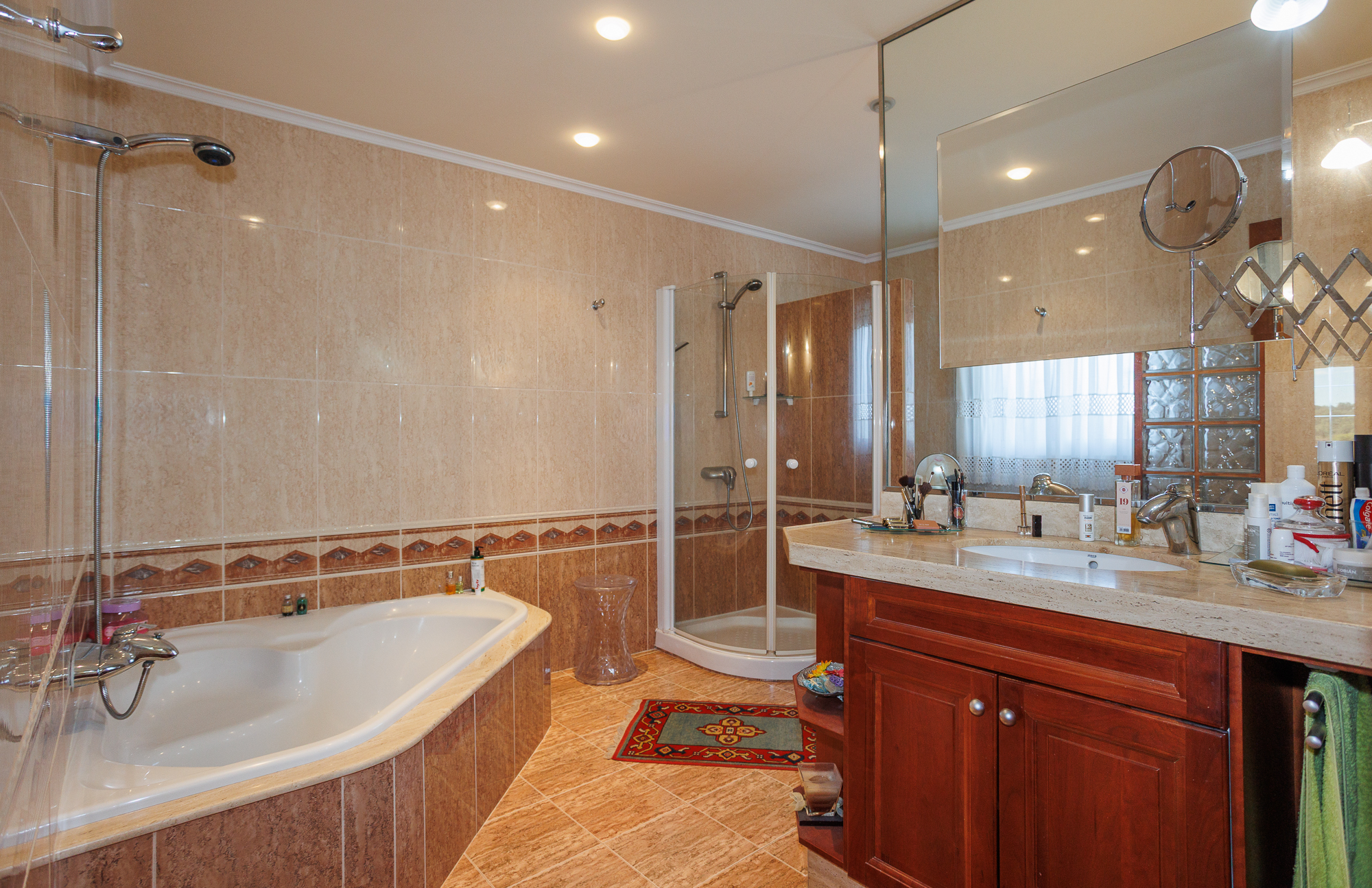 La primera planta se distribuye desde un gran salón que conecta directamente con la espectacular terraza que recorre dos de las fachadas de la casa. Esta planta también incluye un aseo, un dormitorio principal con balcón, despacho y zona de vestidor, y un baño completo con bañera, plato de ducha y lavabo doble.