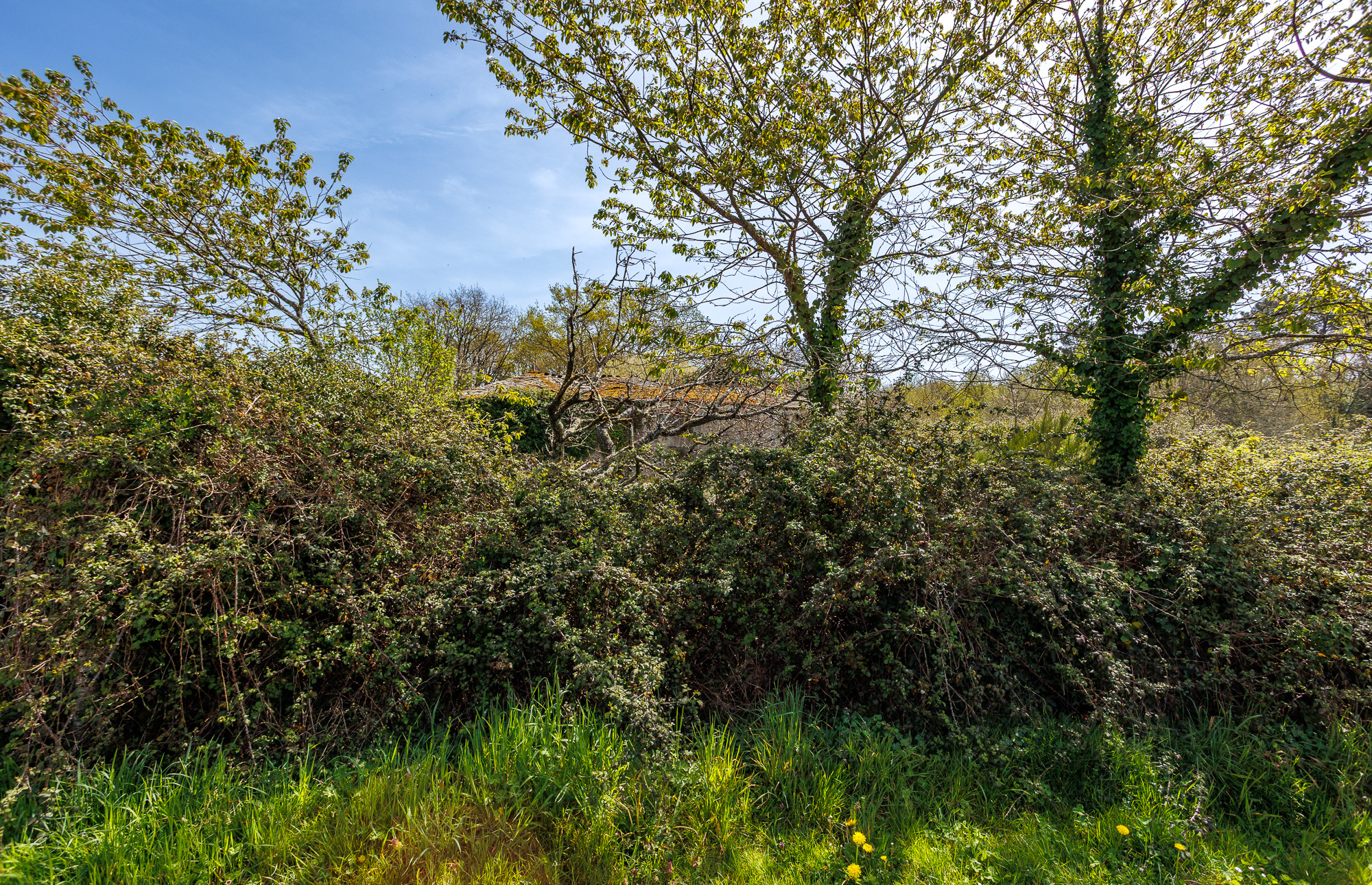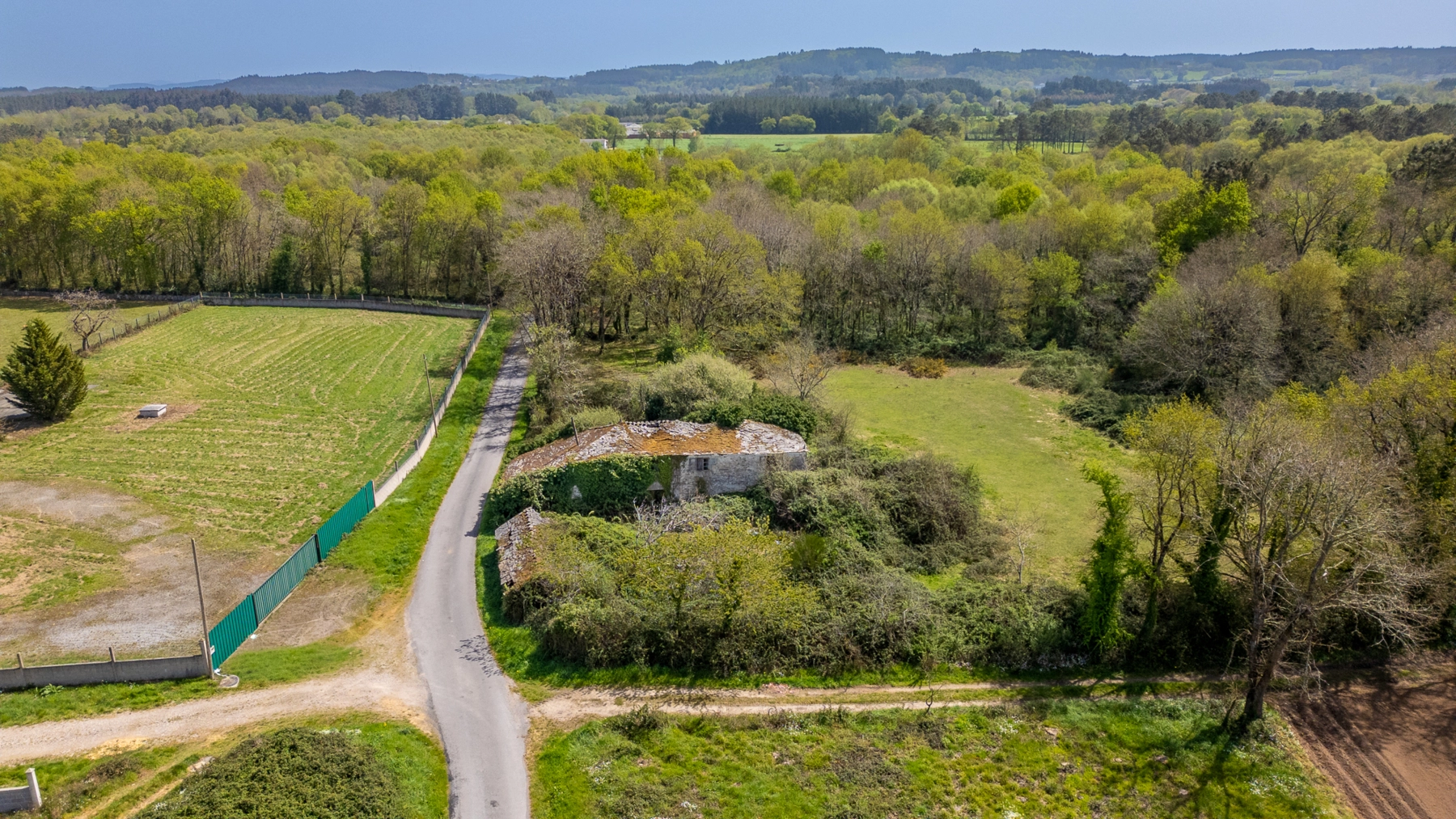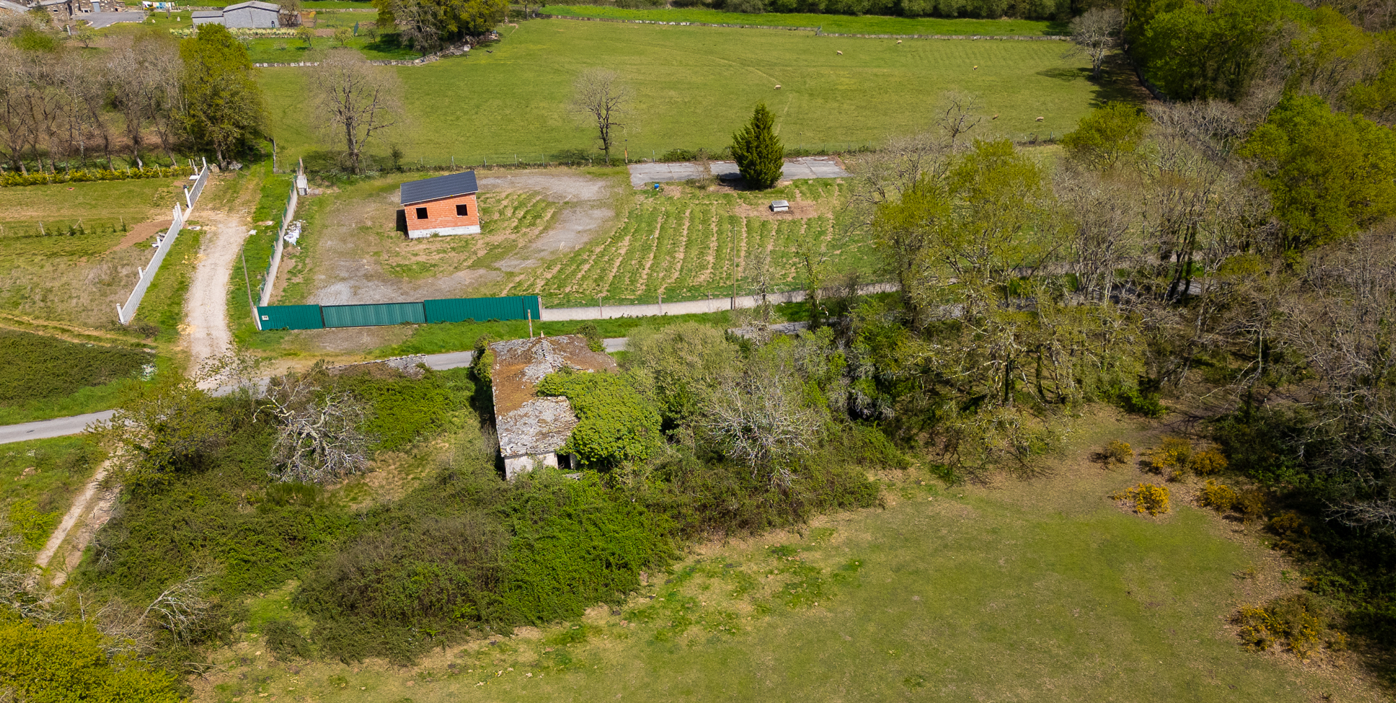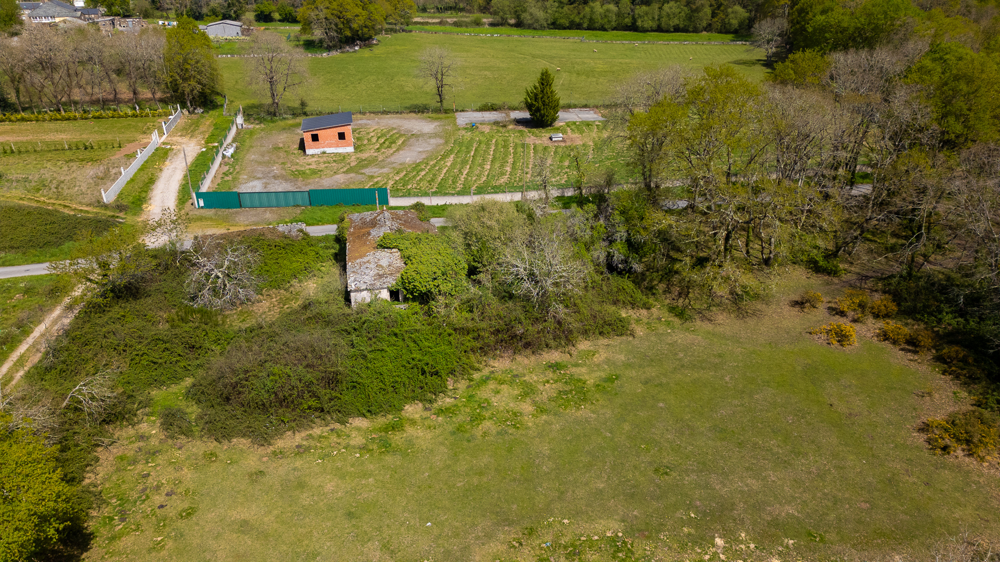 El terreno de 15.649 m² es completamente llano y se agrupa en una sola parcela contigua a las construcciones. Esta configuración, poco habitual en el interior de Galicia, es uno de los principales valores de la propiedad.