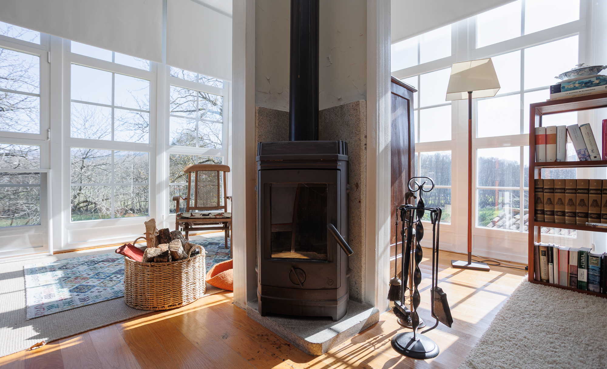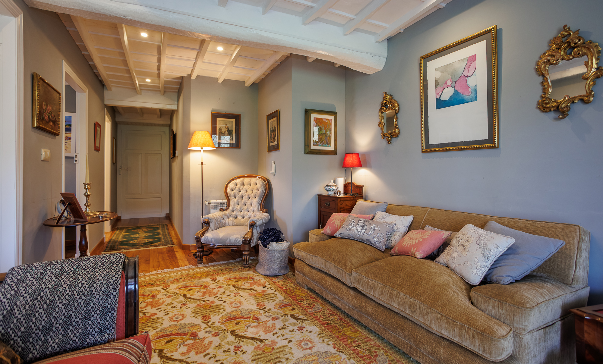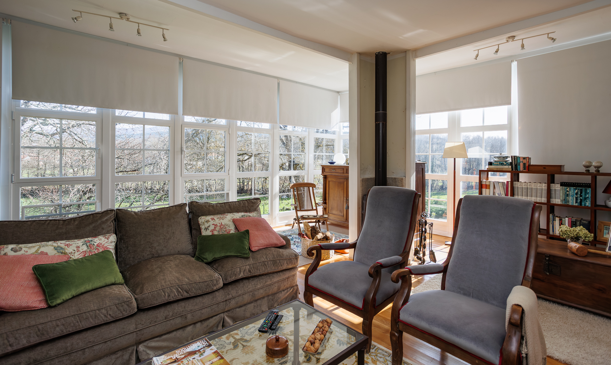 Uno de los salones da acceso al balcón de piedra situado en la fachada principal, mientras que el otro alberga una espectacular galería acristalada que recorre dos de sus paredes, inundando el espacio de luz natural y ofreciendo vistas panorámicas al jardín y al entorno.