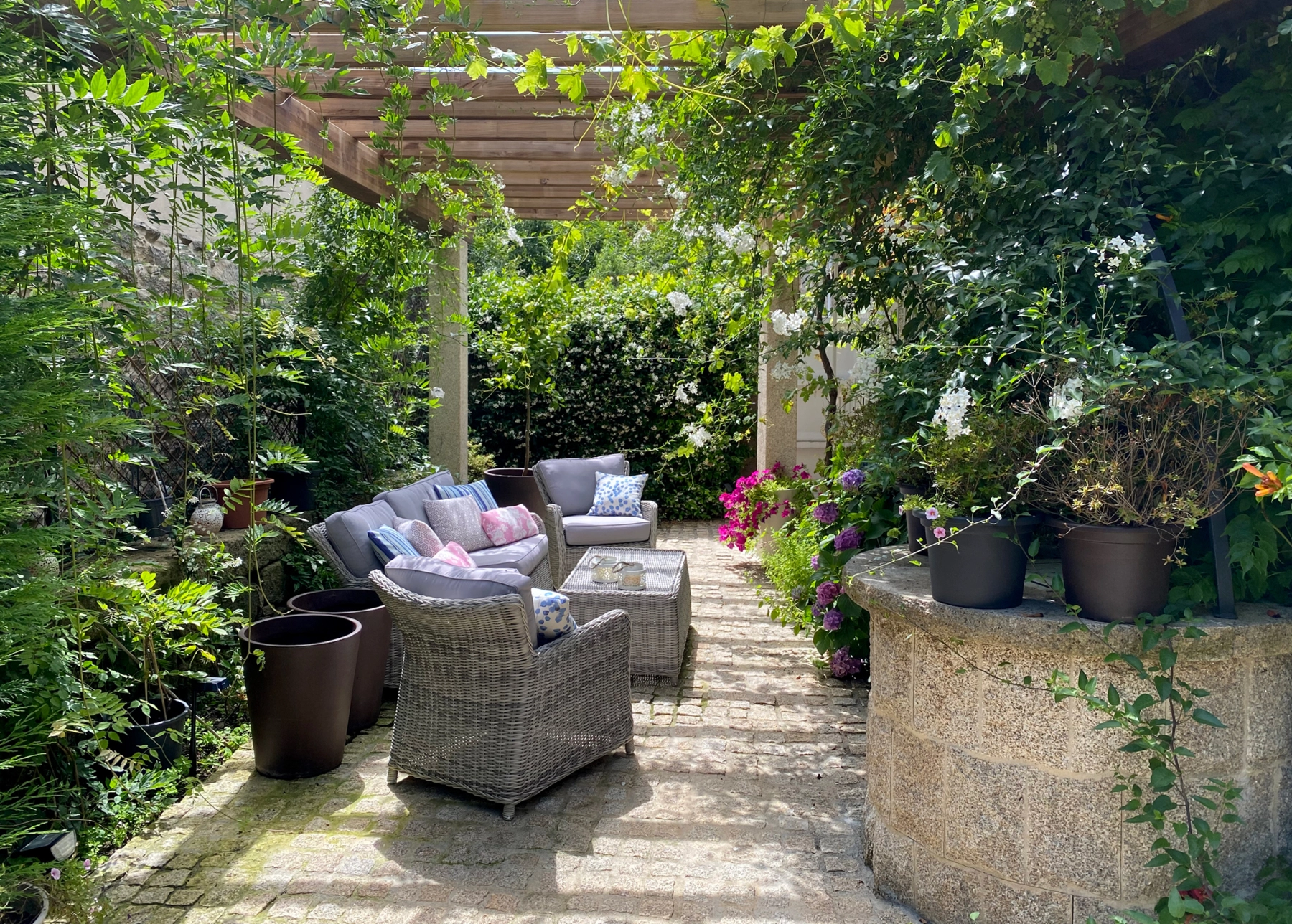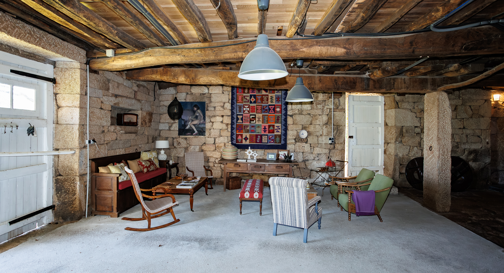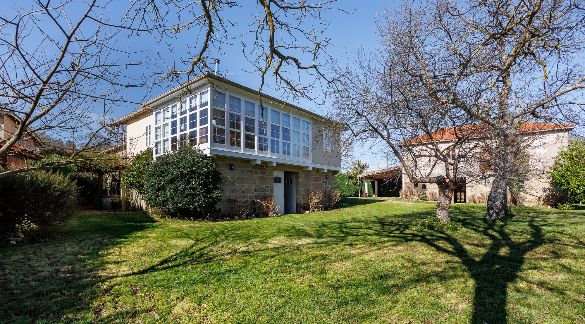 En otro rincón del jardín, bajo una pérgola situada junto a la casa, se encuentra el pozo de piedra y una zona de estar adicional. A pocos metros se alza un hórreo tradicional gallego con estructura de granito, madera y teja, representando uno de los elementos patrimoniales más icónicos de la arquitectura rural gallega.