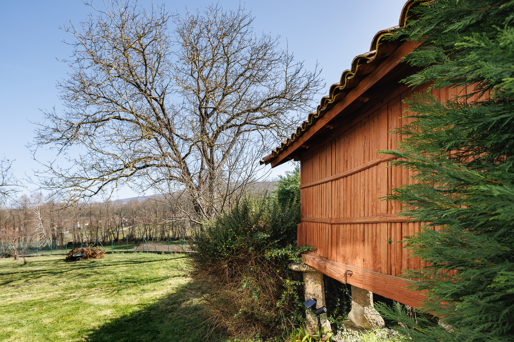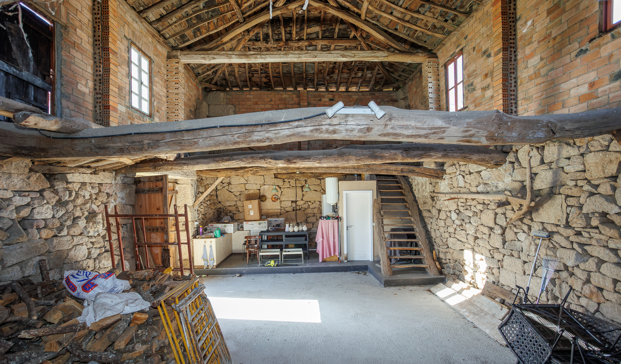 Frente a ella se levanta el pajar, una construcción de grandes dimensiones en buen estado estructural, con una hermosa estructura de vigas de madera bajo el tejado. Se trata de un espacio diáfano de dos alturas pendiente de restauración, si bien ya dispone de una pequeña cocina plenamente funcional y un cuarto de baño terminado. Adosado al pajar, un espacioso porche de madera crea una excelente zona de estar junto a la piscina.