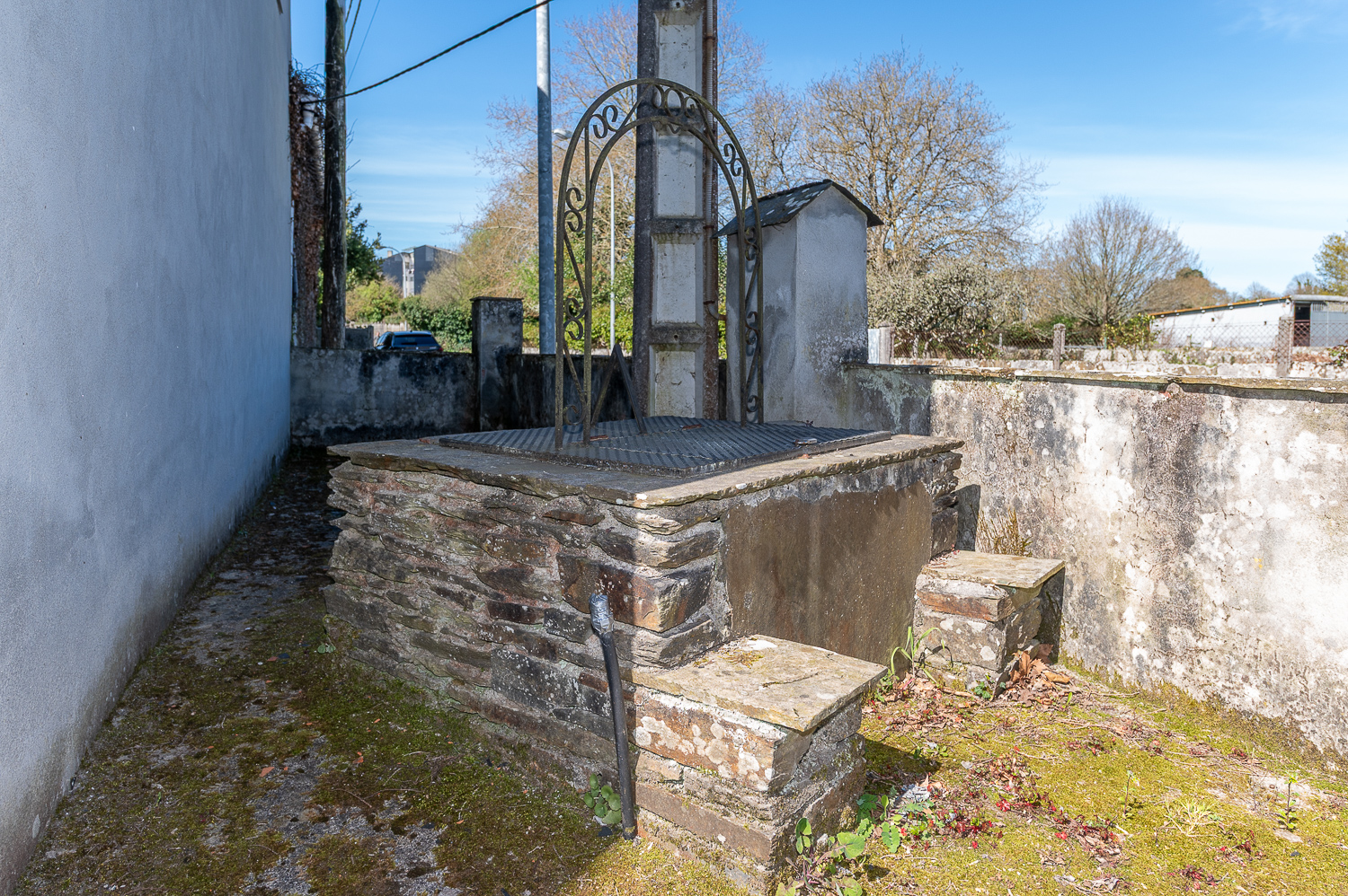 El conjunto incluye la vivienda principal de dos plantas, un garaje, una terraza cubierta en la planta superior y un pozo de piedra en la parcela.