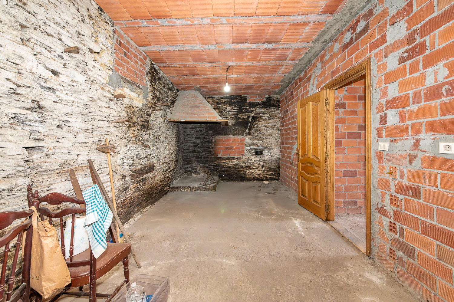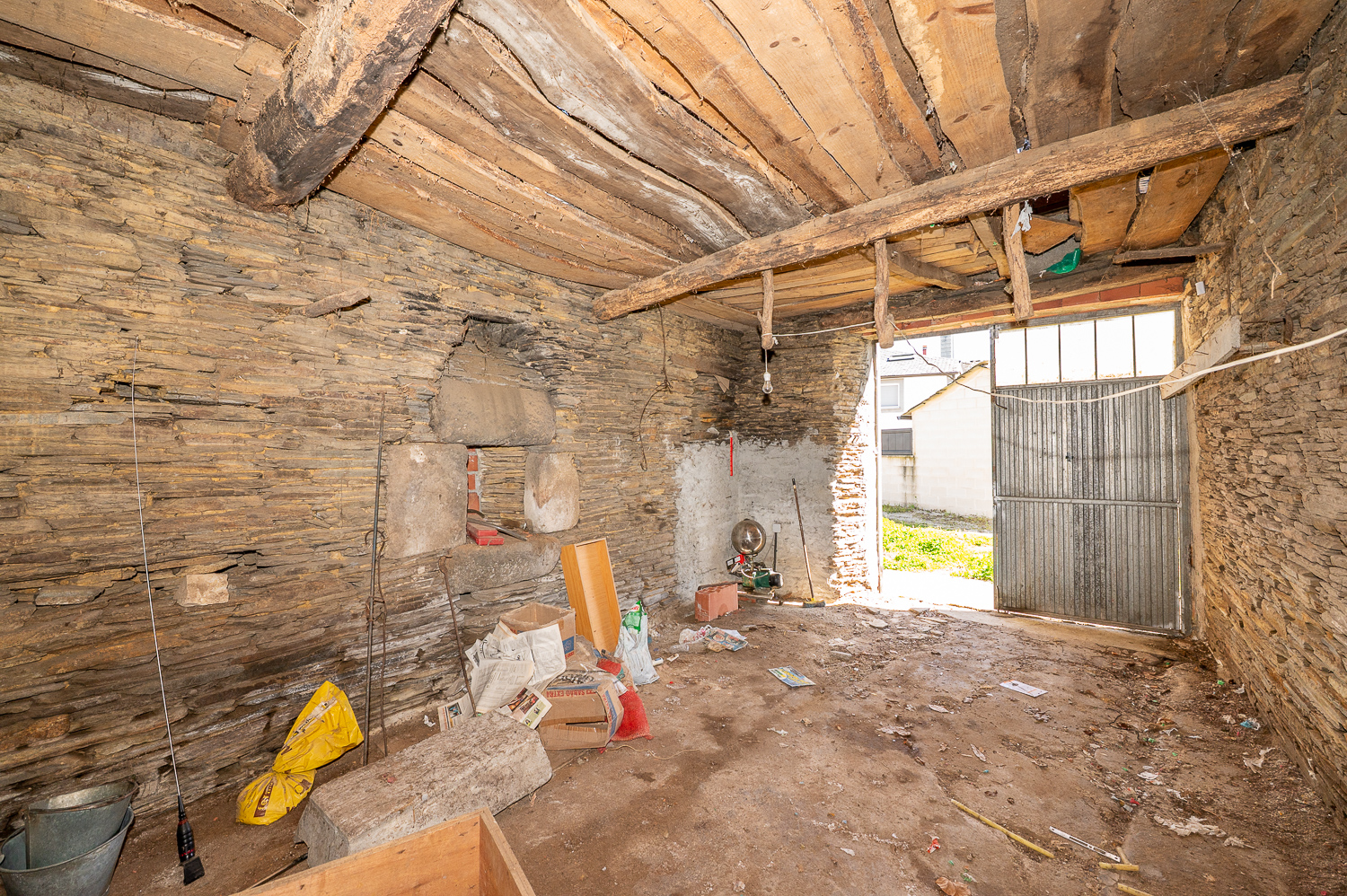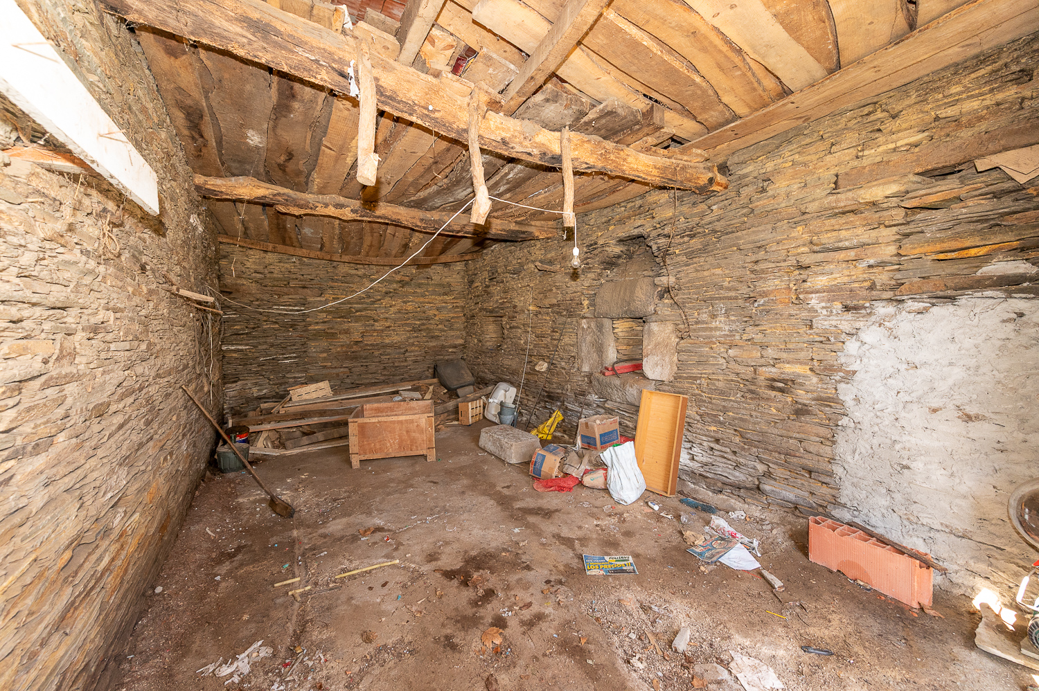 La casa presenta una estructura sólida, con cubierta de pizarra en muy buen estado y muros de piedra en buenas condiciones. El interior ofrece múltiples posibilidades para personalizar los acabados: la planta baja tiene los espacios ya delimitados —con sus puertas de madera instaladas— y pendientes de terminar, mientras que la planta superior está más avanzada, con suelo de gres y carpintería de madera ya instalados.