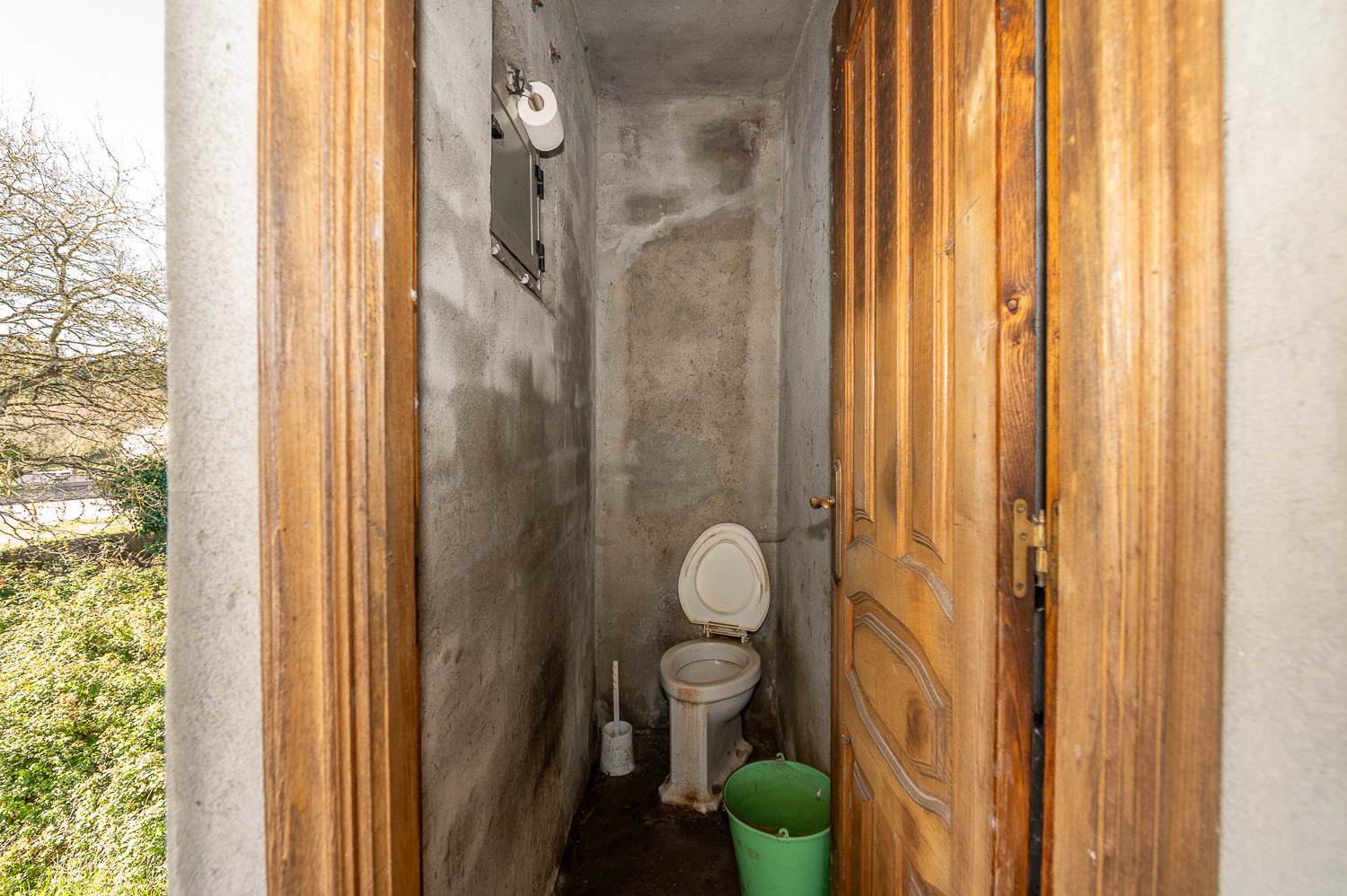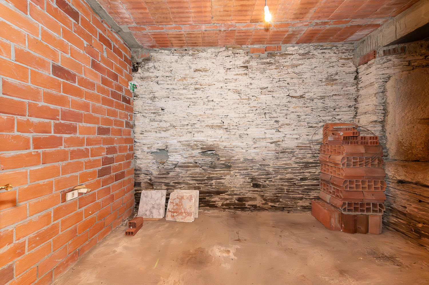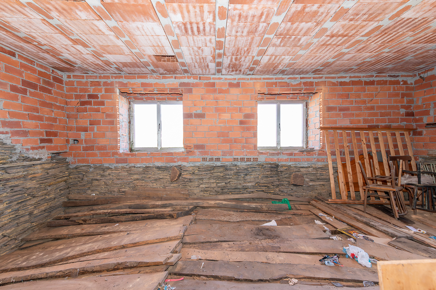 La casa presenta una estructura sólida, con cubierta de pizarra en muy buen estado y muros de piedra en buenas condiciones. El interior ofrece múltiples posibilidades para personalizar los acabados: la planta baja tiene los espacios ya delimitados —con sus puertas de madera instaladas— y pendientes de terminar, mientras que la planta superior está más avanzada, con suelo de gres y carpintería de madera ya instalados.