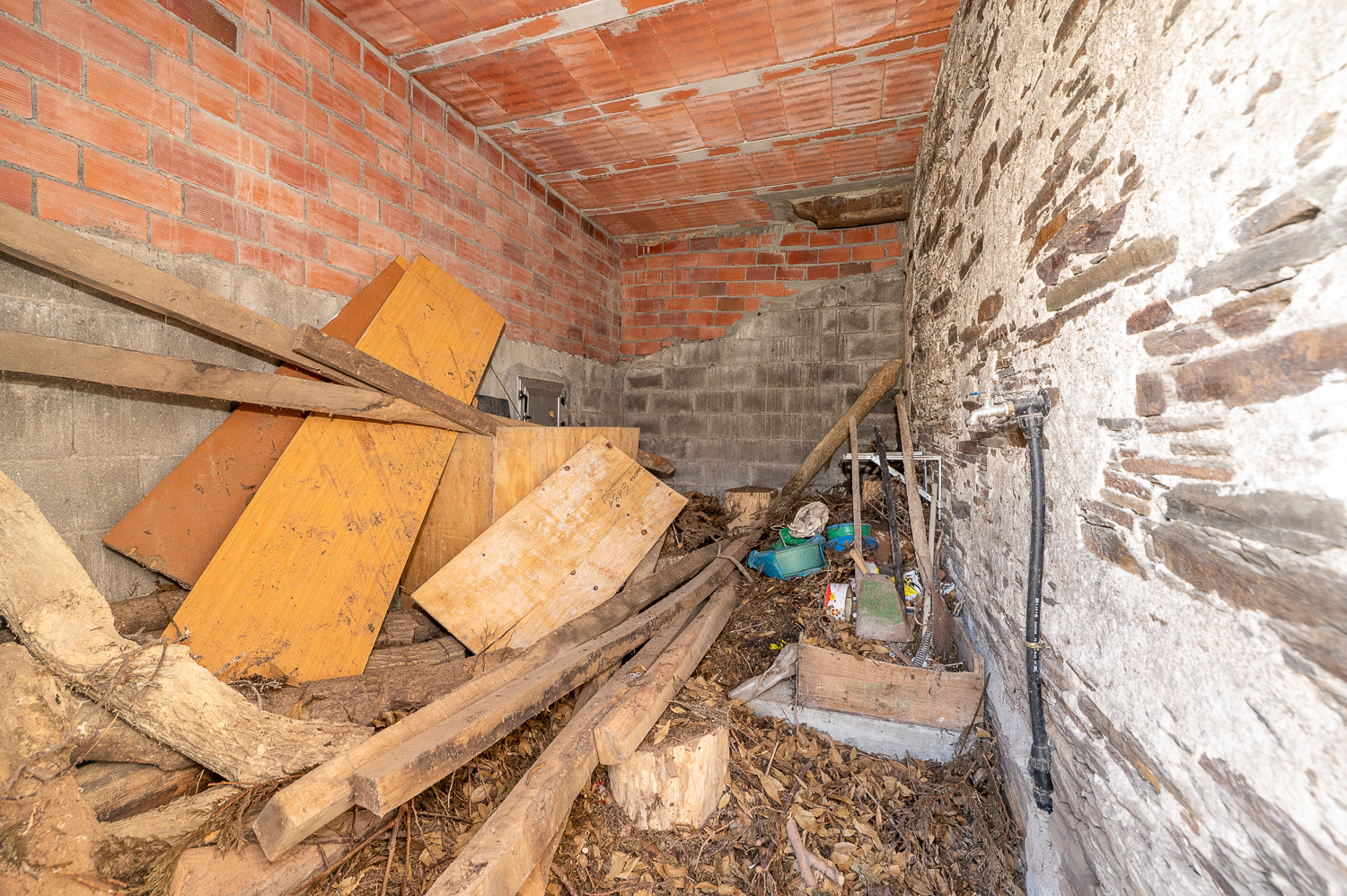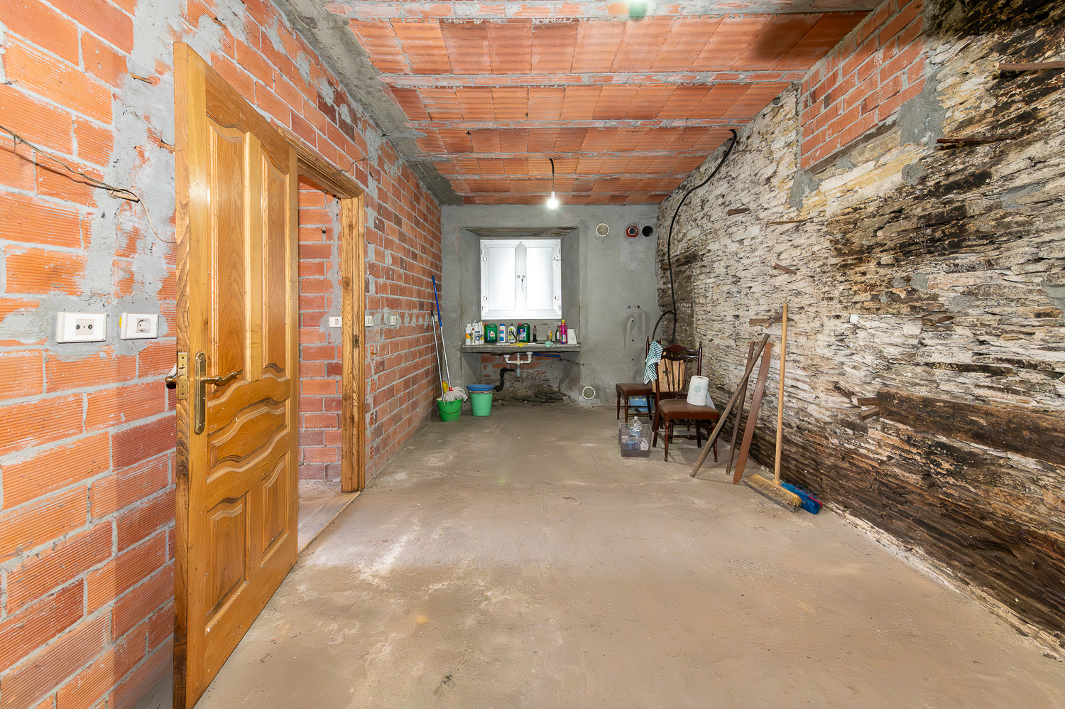 La planta baja se organiza a través de un pasillo recibidor con paredes de ladrillo visto desde el que se accede, a la izquierda, a las escaleras de granito que comunican con la planta superior. El pasillo conduce también a un cuarto destinado a cuarto de baño —aún sin ejecutar—, a una amplia estancia con lareira pensada para ser la cocina y a un cuarto espacioso con potencial de salón. El garaje y una estancia adicional utilizada como leñero completan esta planta, ambos accesibles desde el exterior.