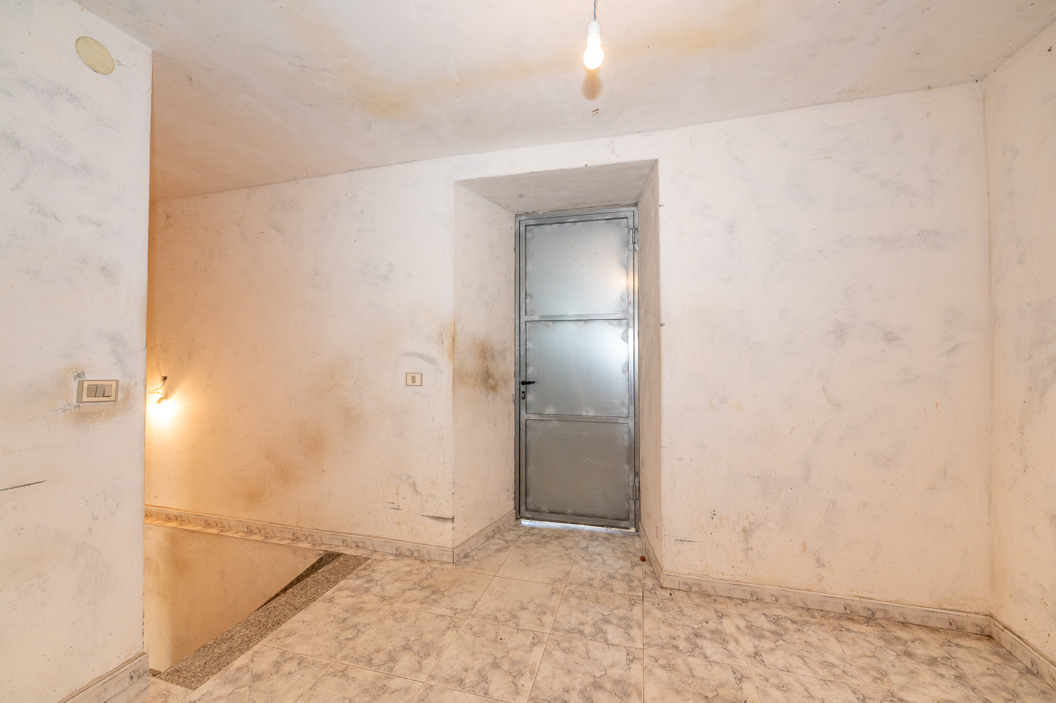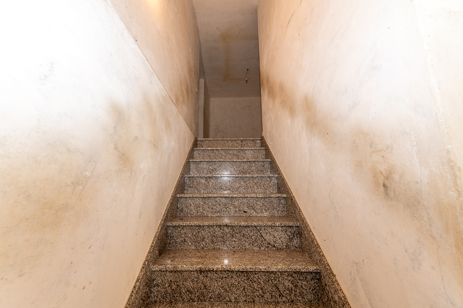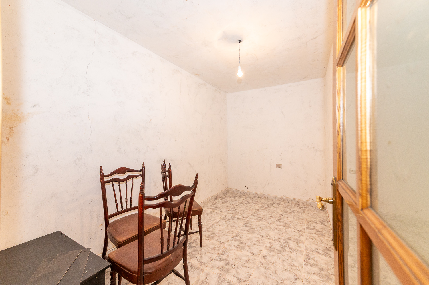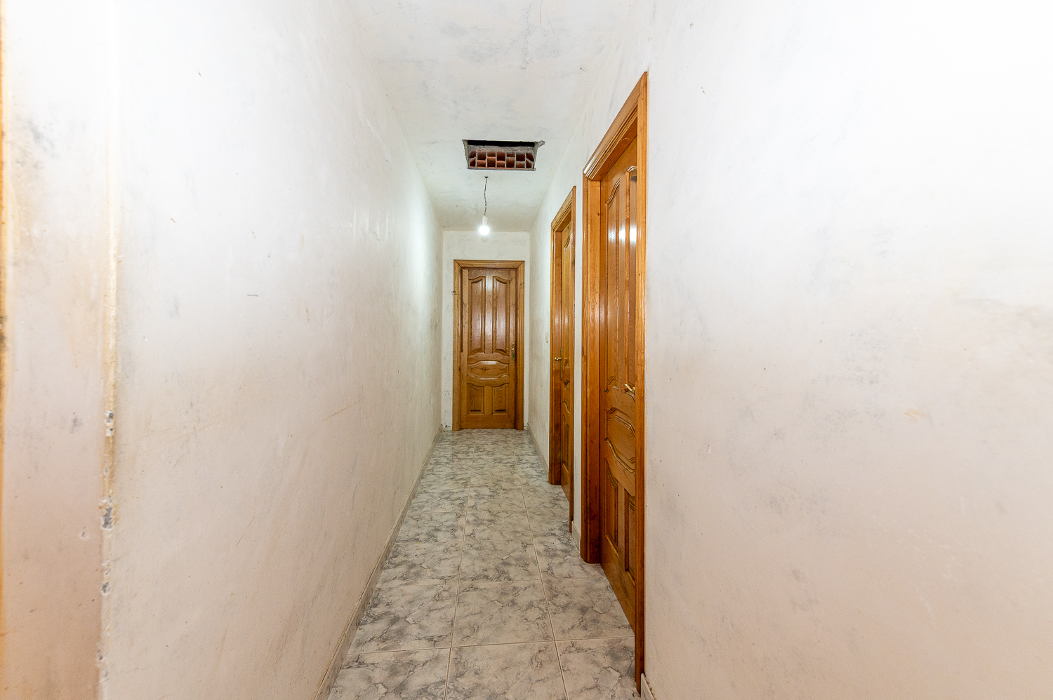 La planta superior cuenta con un amplio recibidor desde el que se accede a la terraza cubierta con vistas al entorno y un pasillo que conduce a las habitaciones. En total, la planta superior alberga cuatro habitaciones —una pequeña, dos de tamaño normal y un cuarto amplio pendiente de terminar— además de un acceso al desván en el techo del pasillo. Las paredes están revocadas y pendientes de pintar; el suelo de gres ya está colocado en las zonas más avanzadas de esta planta.